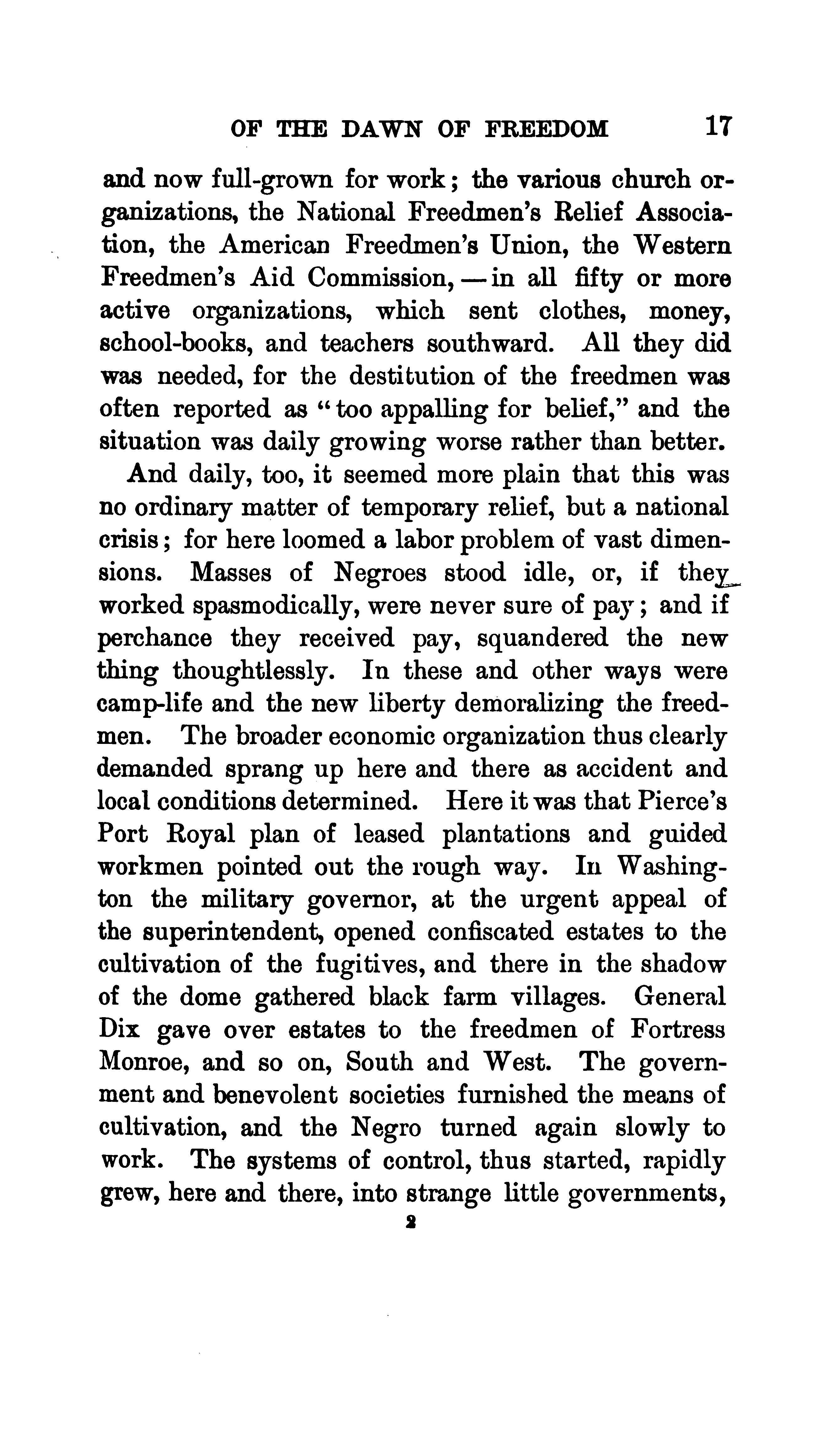 and now full-grown for work; the various church organizations, the National Freedmen's Relief Association, the American Freedmen's Union, the Western Freedmen's Aid Commission, in all fifty or more active organizations, which sent clothes, money, school-books, and teachers southward. All they did was needed, for the destitution of the freedmen was often reported as " too appalling for belief," and the situation was daily growing worse rather than better. And daily, too, it seemed more plain that this was no ordinary matter of temporary relief, but a national crisis ; for here loomed a labor problem of vast dimensions. Masses of Negroes stood idle, or, if they worked spasmodically, were never sure of pay ; and if perchance they received pay, squandered the new thing thoughtlessly. In these and other ways were camp-life and the new liberty demoralizing the freedmen. The broader economic organization thus clearly demanded sprang up here and there as accident and local conditions determined. Here it was that Pierce's Port Royal plan of leased plantations and guided workmen pointed out the rough way. In Washington the military governor, at the urgent appeal of the superintendent, opened confiscated estates to the cultivation of the fugitives, and there in the shadow of the dome gathered black farm villages. General Dix gave over estates to the freedmen of Fortress Monroe, and so on, South and West. The government and benevolent societies furnished the means of cultivation, and the Negro turned again slowly to work. The systems of control, thus started, rapidly grew, here and there, into strange little governments,
