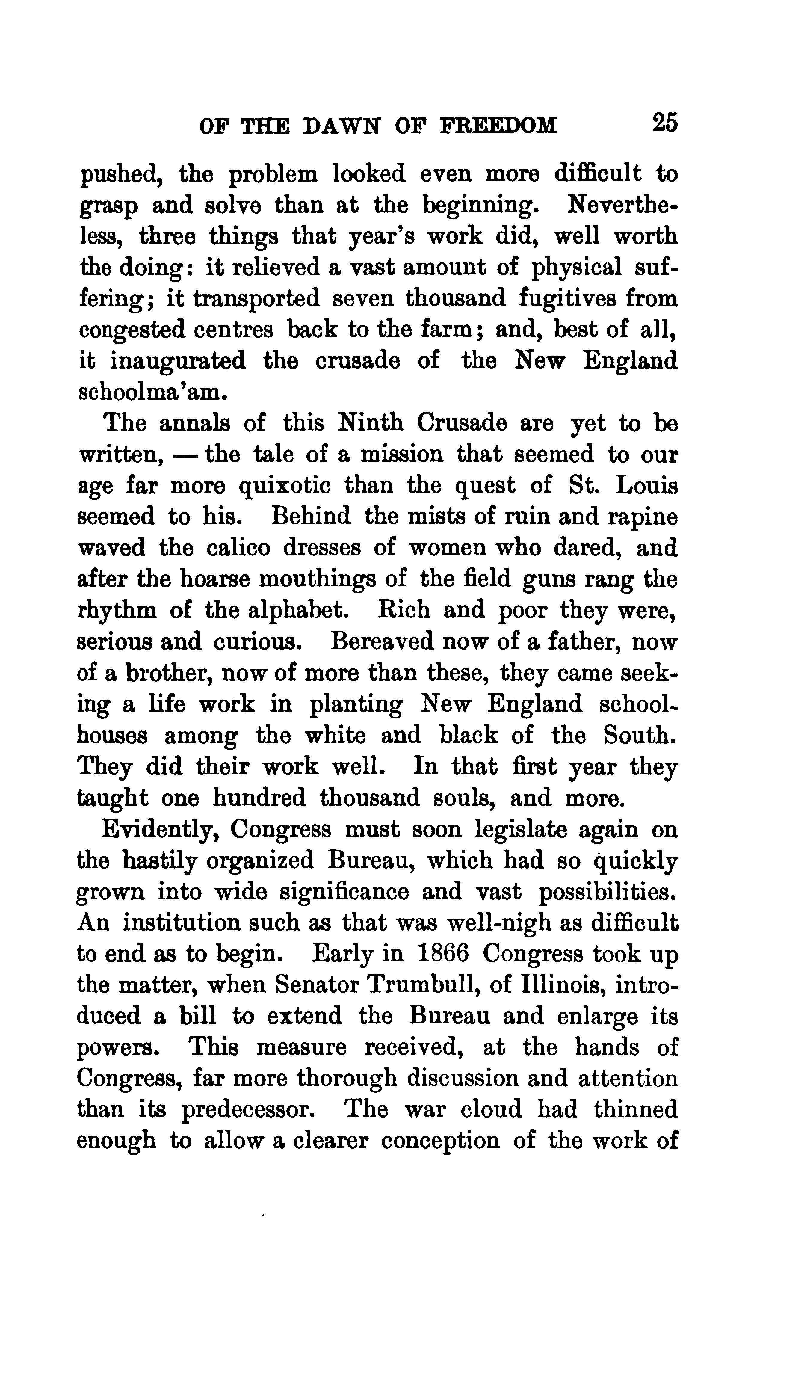 The annals of this Ninth Crusade are yet to be written, the tale of a mission that seemed to our age far more quixotic than the quest of St. Louis seemed to his. Behind the mists of ruin and rapine waved the calico dresses of women who dared, and after the hoarse mouthings of the field guns rang the rhythm of the alphabet. Rich and poor they were, serious and curious. Bereaved now of a father, now of a brother, now of more than these, they came seeking a life work in planting New England schoolhouses among the white and black of the South. They did their work well. In that first year they taught one hundred thousand souls, and more.