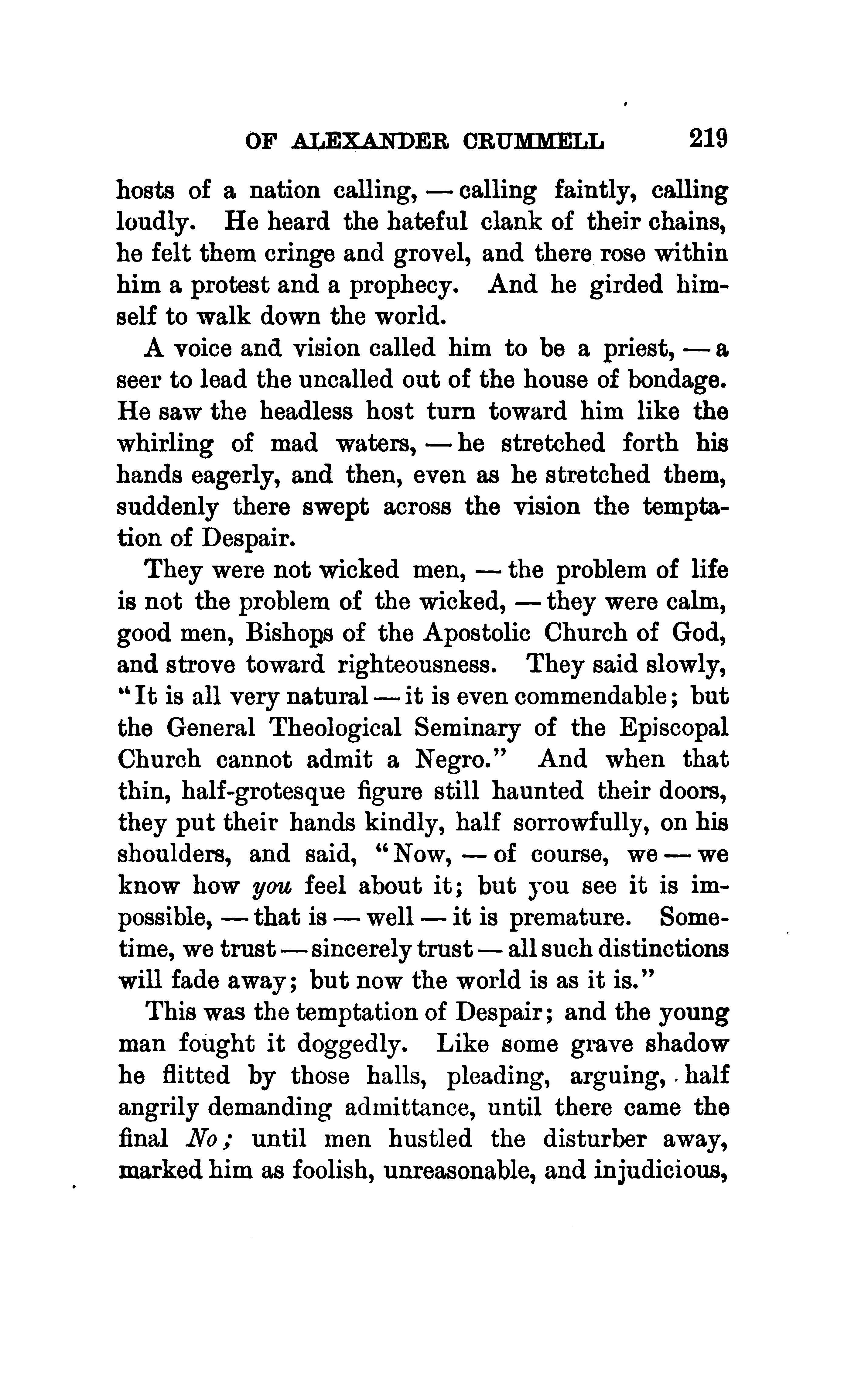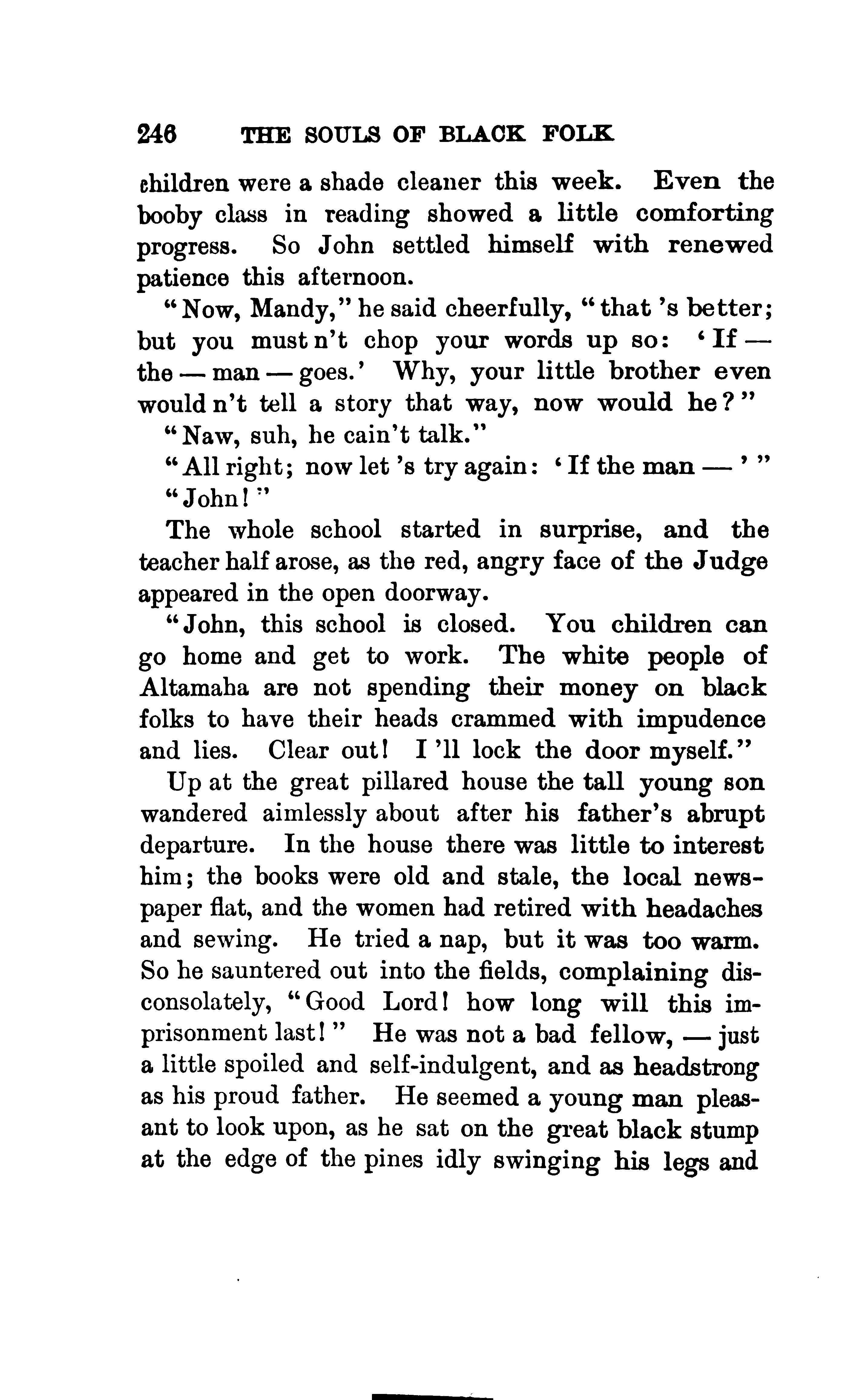 theirs, not mine. But they should not keep these prizes, I said; some, all, I would wrest from them. Just howI would do it I could never decide: by reading law, by healing the sick, by telling the wonderful tales that swam in my head, some way. With other black boys the strife was not so fiercely sunny: their youth shrunk into tasteless sycophancy, or into silent hatred of the pale world about them and mocking distrust of everything white ; or wasted itself in a bitter cry, Why did God make me an outcast and a stranger in mine own house ? The shades of the prison-house closed round about us all: walls strait and stubborn to the whitest, but relentlessly narrow, tall, and unscalable to sons of night who must plod darkly on in resignation, or beat unavailing palms against the stone, or steadily, half hopelessly, watch the streak of blue above.