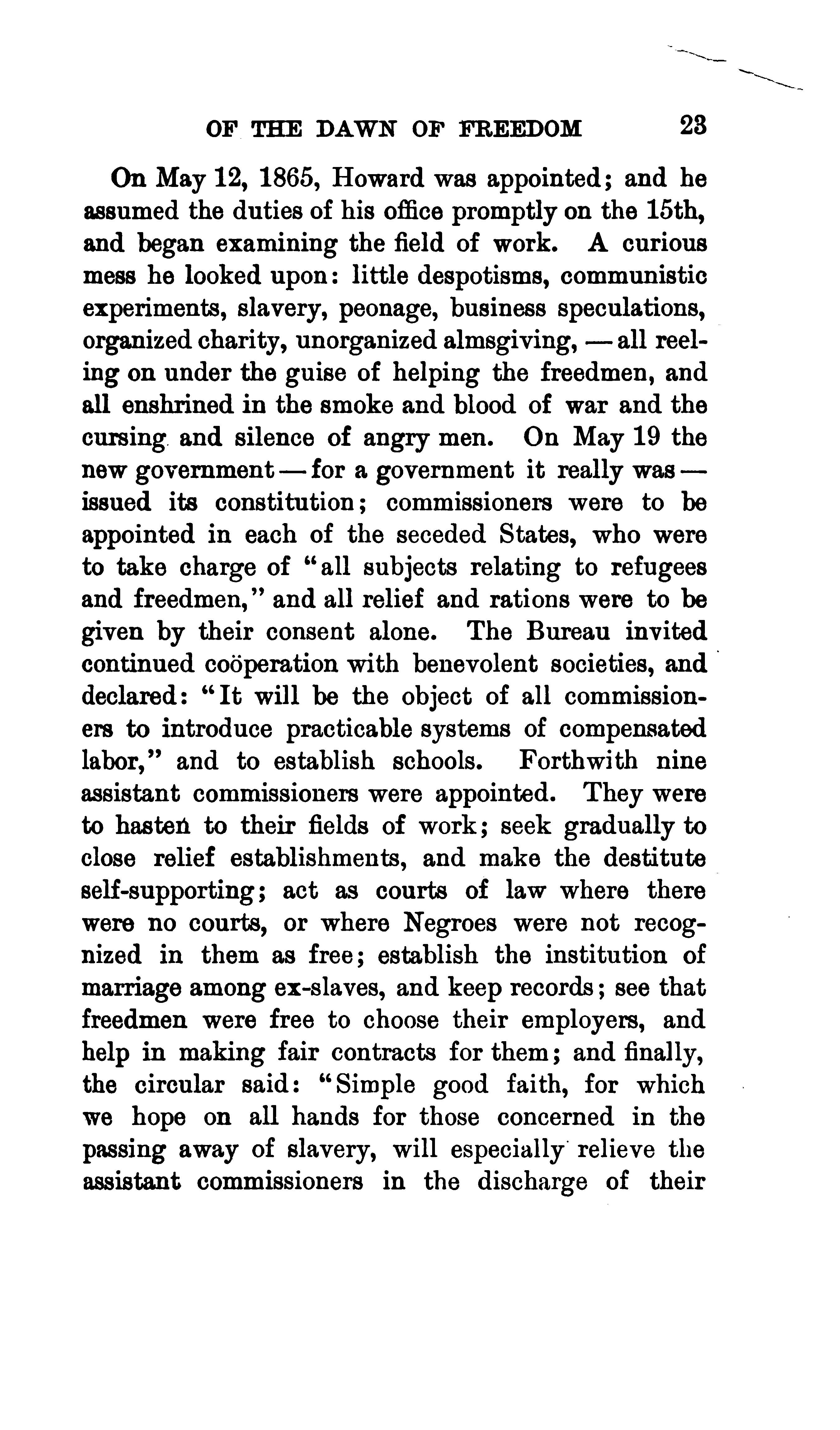 On May 12, 1865, Howard was appointed; and he assumed the duties of his office promptly on the 15th, and began examining the field of work. A curious mess he looked upon: little despotisms, communistic experiments, slavery, peonage, business speculations, organized charity, unorganized almsgiving, all reeling on under the guise of helping the freedmen, and all enshrined in the smoke and blood of war and the cursing and silence of angry men. On May 19 the new government-for a government it really was issued its constitution ; commissioners were to be appointed in each of the seceded States, who were to take charge of " all subjects relating to refugees and freedmen," and all relief and rations were to be given by their consent alone. The Bureau invited continued coöperation with benevolent societies, and declared: " It will be the object of all commissioners to introduce practicable systems of compensated labor," and to establish schools. Forthwith nine assistant commissioners were appointed. They were to hasten to their fields of work; seek gradually to close relief establishments, and make the destitute self-supporting; act as courts of law where there were no courts, or where Negroes were not recognized in them as free ; establish the institution of marriage among ex-slaves, and keep records ; see that freedmen were free to choose their employers, and help in making fair contracts for them; and finally, the circular said: "Simple good faith, for which we hope on all hands for those concerned in the passing away of slavery, will especially relieve the assistant commissioners in the discharge of their