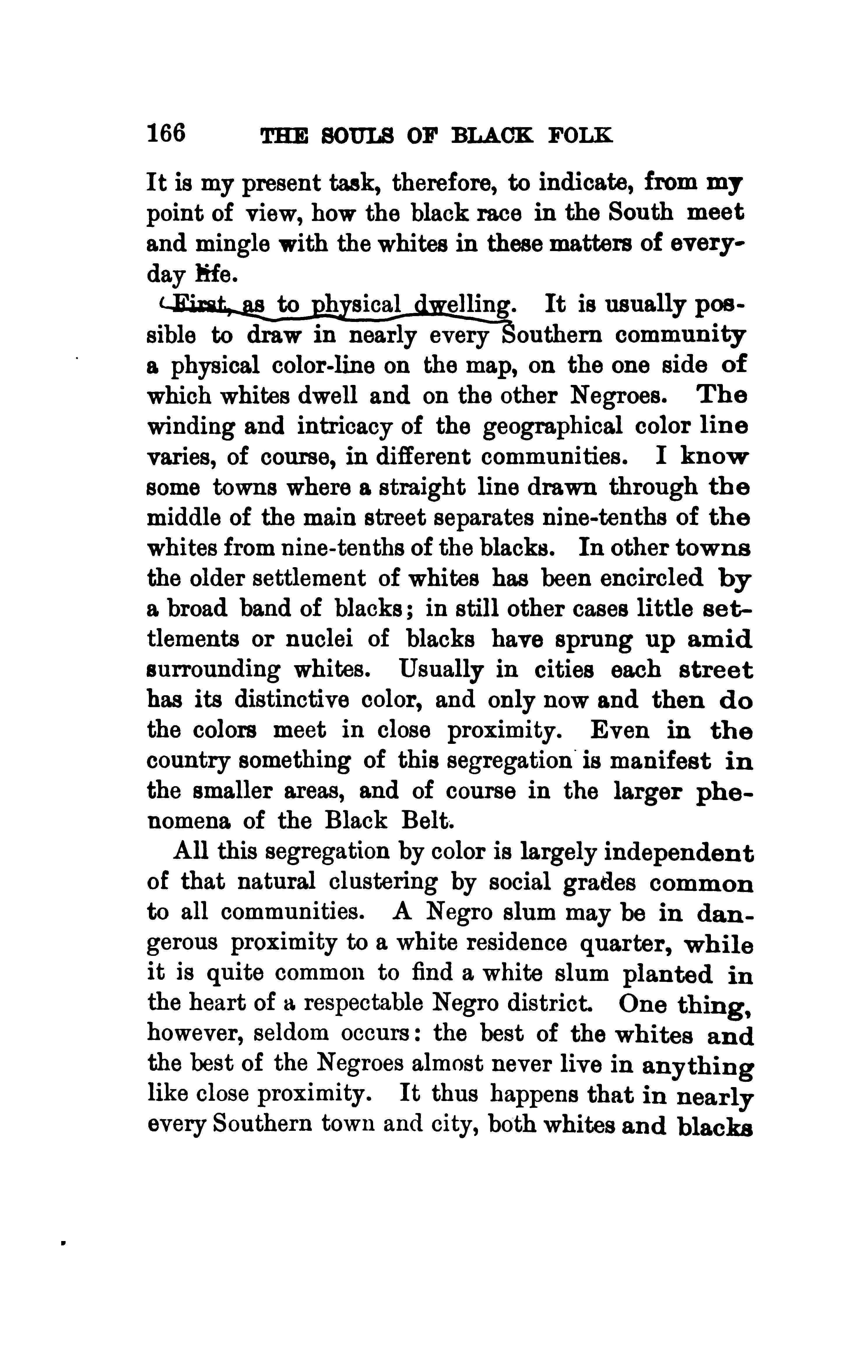 BETWEEN me and the other world there is ever an unasked question : unasked by some throughfeelings ofdelicacy; by others through the difficulty of rightly framing it. All, nevertheless, flutter round it. They approach me in a half-hesitant sort of way, eye me curiously or compassionately, and then, instead of saying directly, How does it feel to be a problem ? they say, I know an excellent