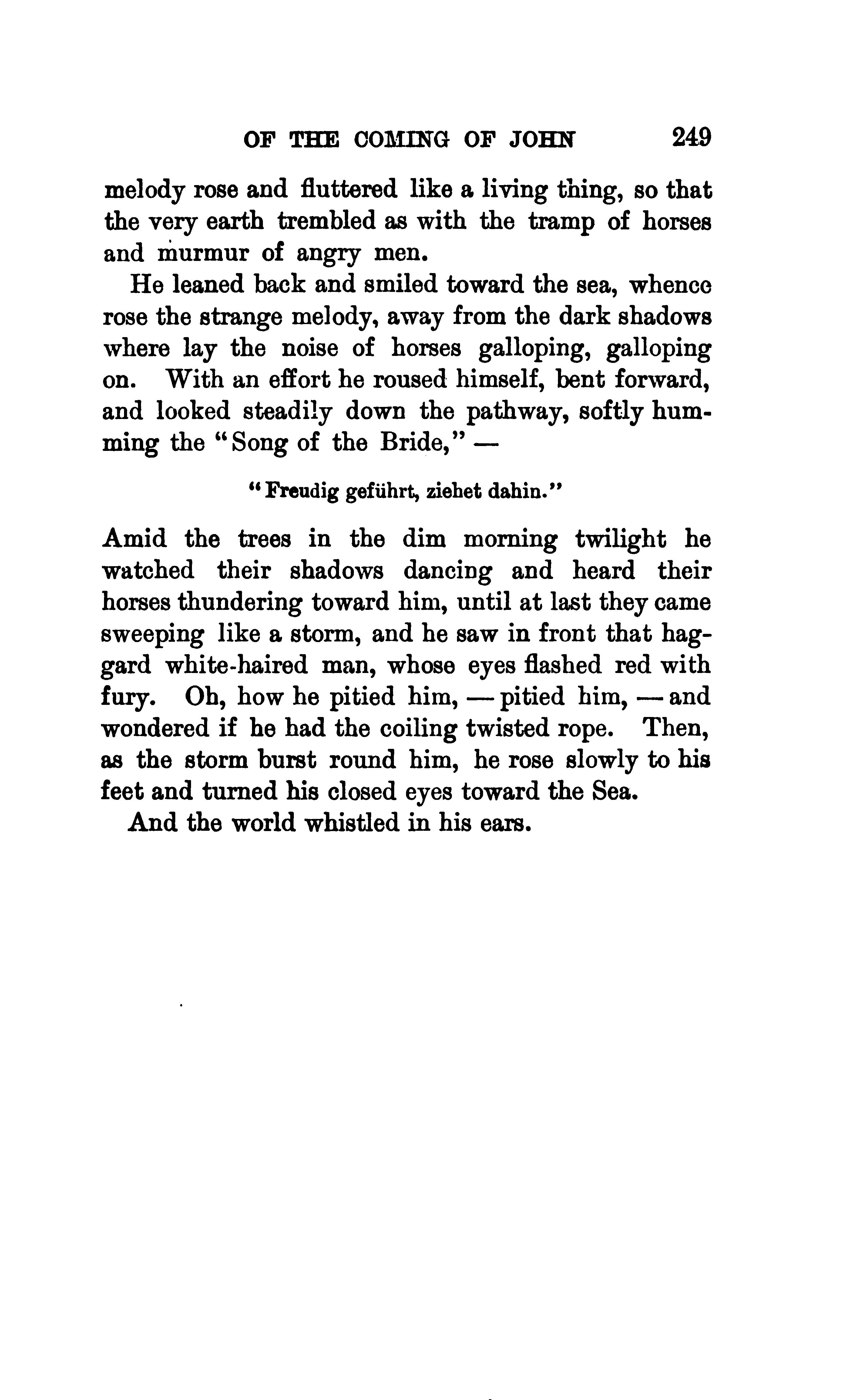 He leaned back and smiled toward the sea, whence rose the strange melody, away from the dark shadows where lay the noise of horses galloping, galloping on. With an effort he roused himself, bent forward, and looked steadily down the pathway, softly humming the " Song of the Bride,"