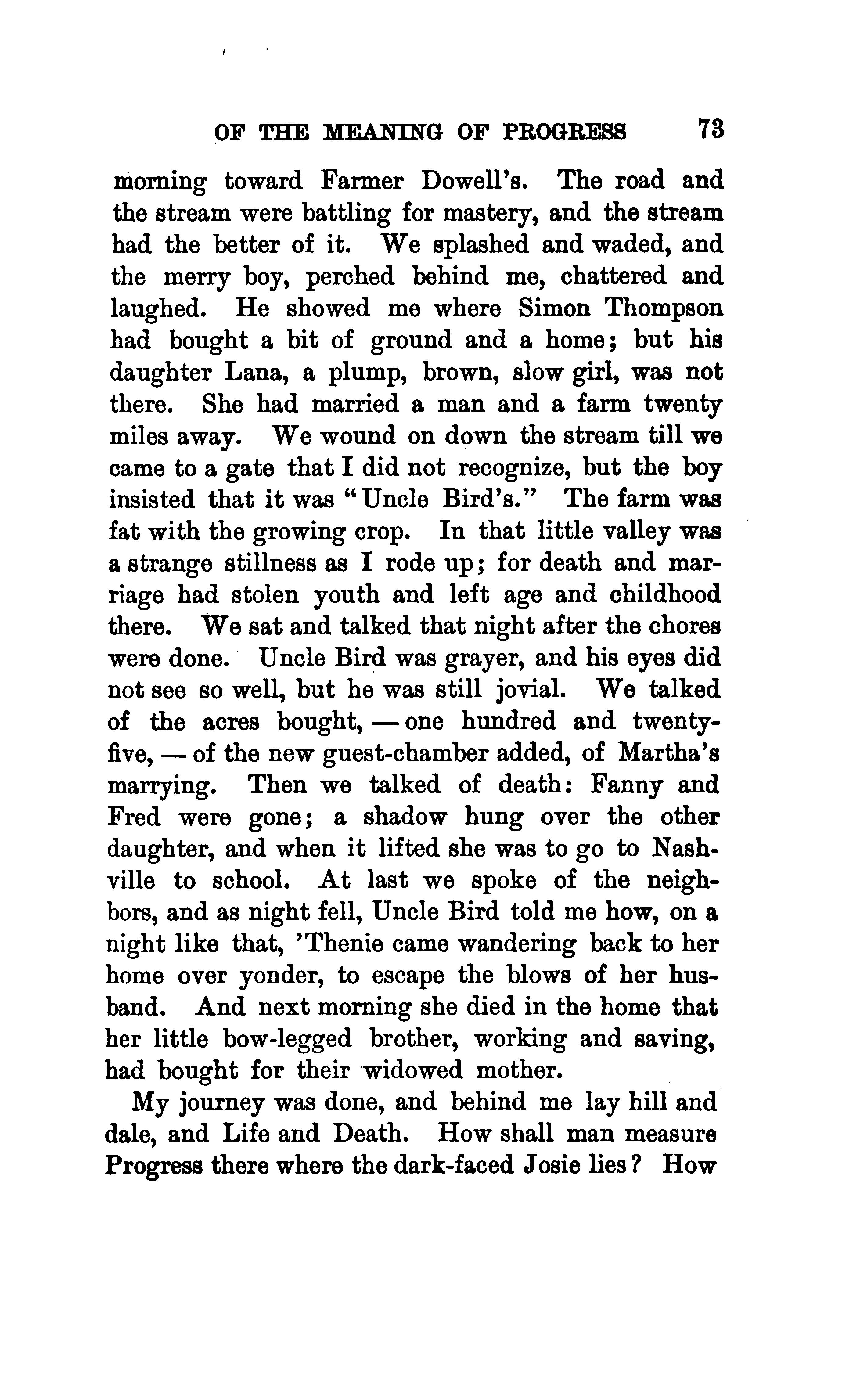 The seventh is the song of the End and the Beginning "My Lord, what a mourning! when the stars begin to fall "; a strain of this is placed before " The Dawn of Freedom." The song of groping-"My way's cloudy" -begins "The Meaning of Progress "; the ninth is the song of this chapter "Wrestlin' Jacob, the day is a-breaking," a pæan --