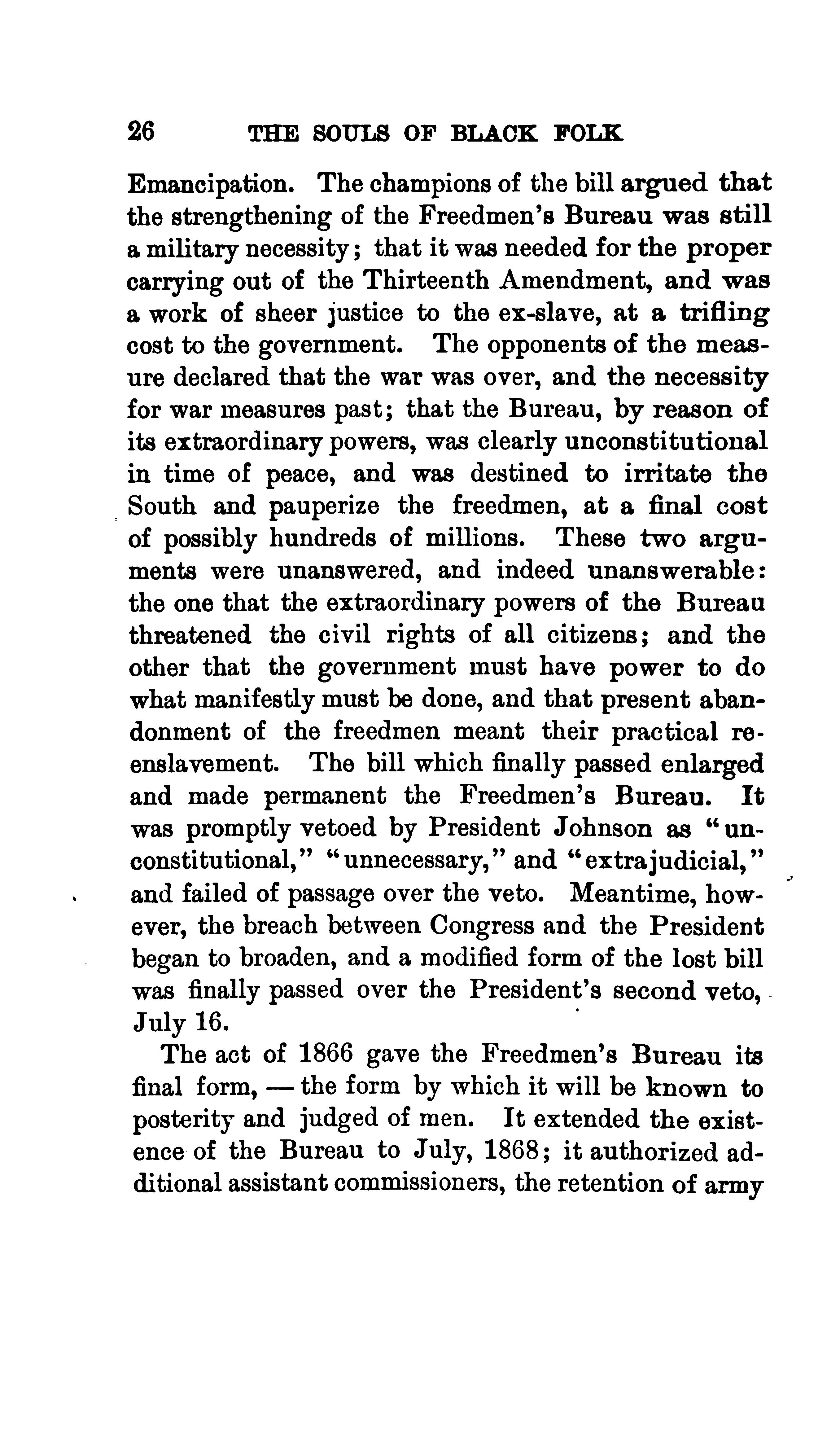 Emancipation. The champions of the bill argued that the strengthening of the Freedmen's Bureau was still amilitary necessity; that it was needed for the proper carrying out of the Thirteenth Amendment, and was a work of sheer justice to the ex-slave, at a trifling cost to the government. The opponents of the measure declared that the war was over, and the necessity for war measures past; that the Bureau, by reason of its extraordinary powers, was clearly unconstitutional in time of peace, and was destined to irritate the South and pauperize the freedmen, at a final cost of possibly hundreds of millions. These two arguments were unanswered, and indeed unanswerable: the one that the extraordinary powers of the Bureau threatened the civil rights of all citizens ; and the other that the government must have power to do what manifestly must be done, and that present abandonment of the freedmen meant their practical reenslavement. The bill which finally passed enlarged and made permanent the Freedmen's Bureau. It was promptly vetoed by President Johnson as unconstitutional," "unnecessary," and " extrajudicial, and failed of passage over the veto. Meantime, however, the breach between Congress and the President began to broaden, and a modified form of the lost bill was finally passed over the President's second veto, July 16.