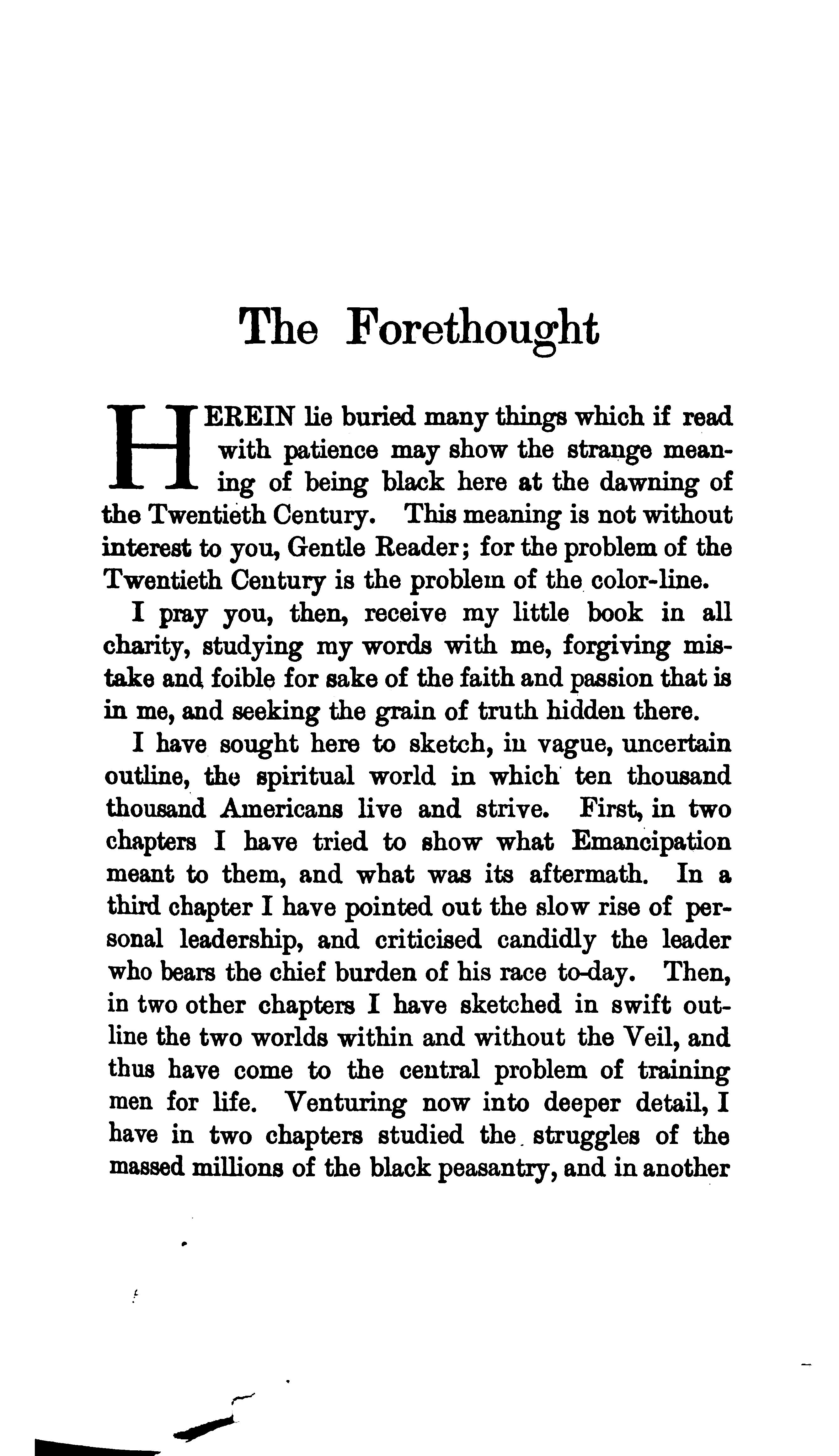HEREIN lie buried many things which if read with patience may showthe strange meaning of being black here at the dawning of the Twentieth Century. This meaning is not without interest to you, Gentle Reader; for the problem of the Twentieth Century is the problem of the color-line.