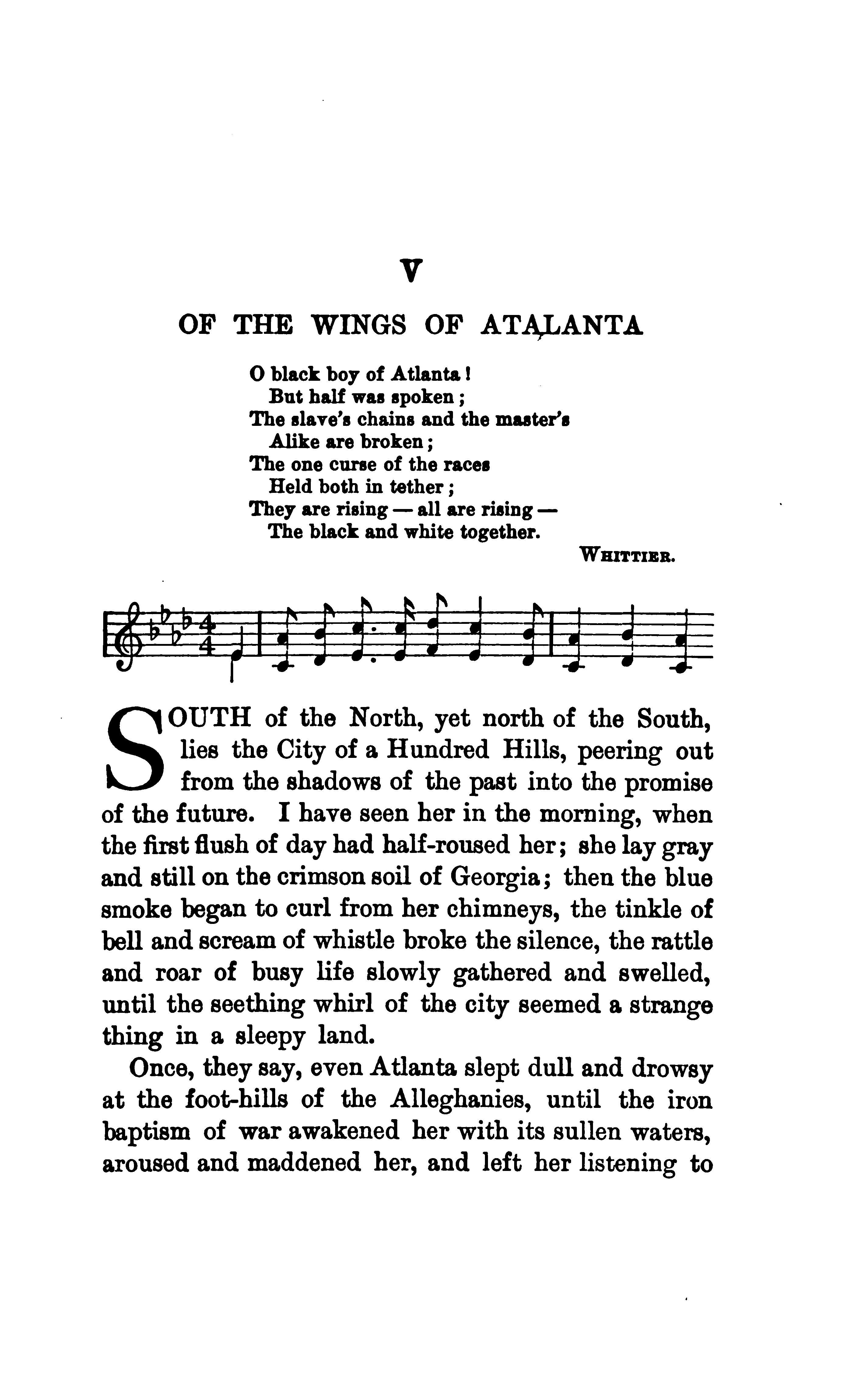 The third song is the cradle-song of death which all men know, "Swing low, sweet chariot," whose bars begin the life story of " Alexander Crummell." Then there is the song of many waters, " Roll, Jordan, roll," a mighty chorus with minor cadences. There were many songs of the fugitive like that which opens " The Wings of Atalanta," and the more familiar " Been a-listening."