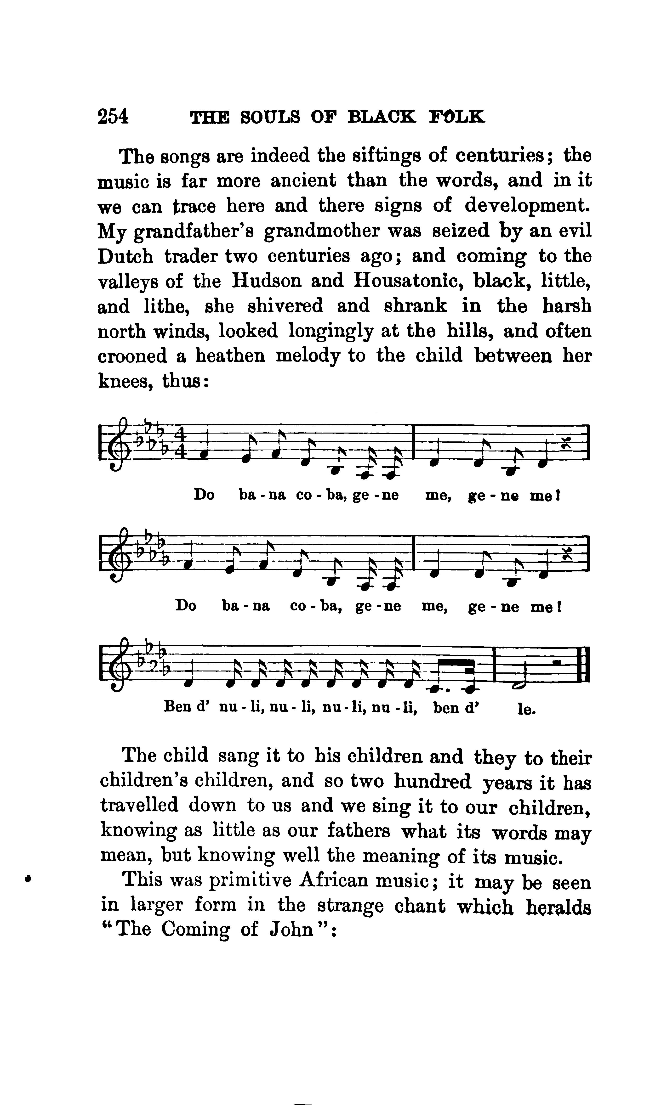 The child sang it to his children and they to their children's children, and so two hundred years it has travelled down to us and we sing it to our children, knowing as little as our fathers what its words may mean, but knowing well the meaning of its music. This was primitive African music ; it may be seen in larger form in the strange chant which heralds "The Coming of John":