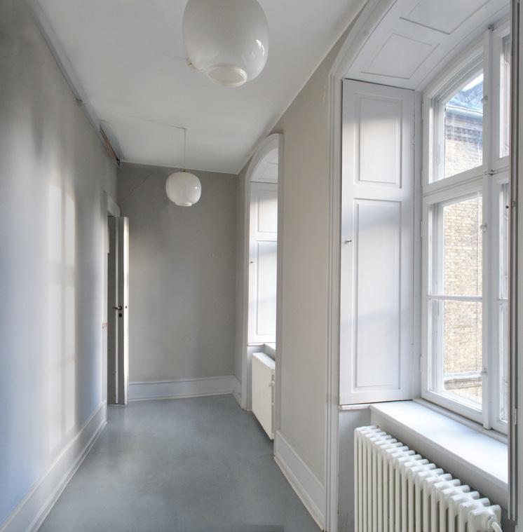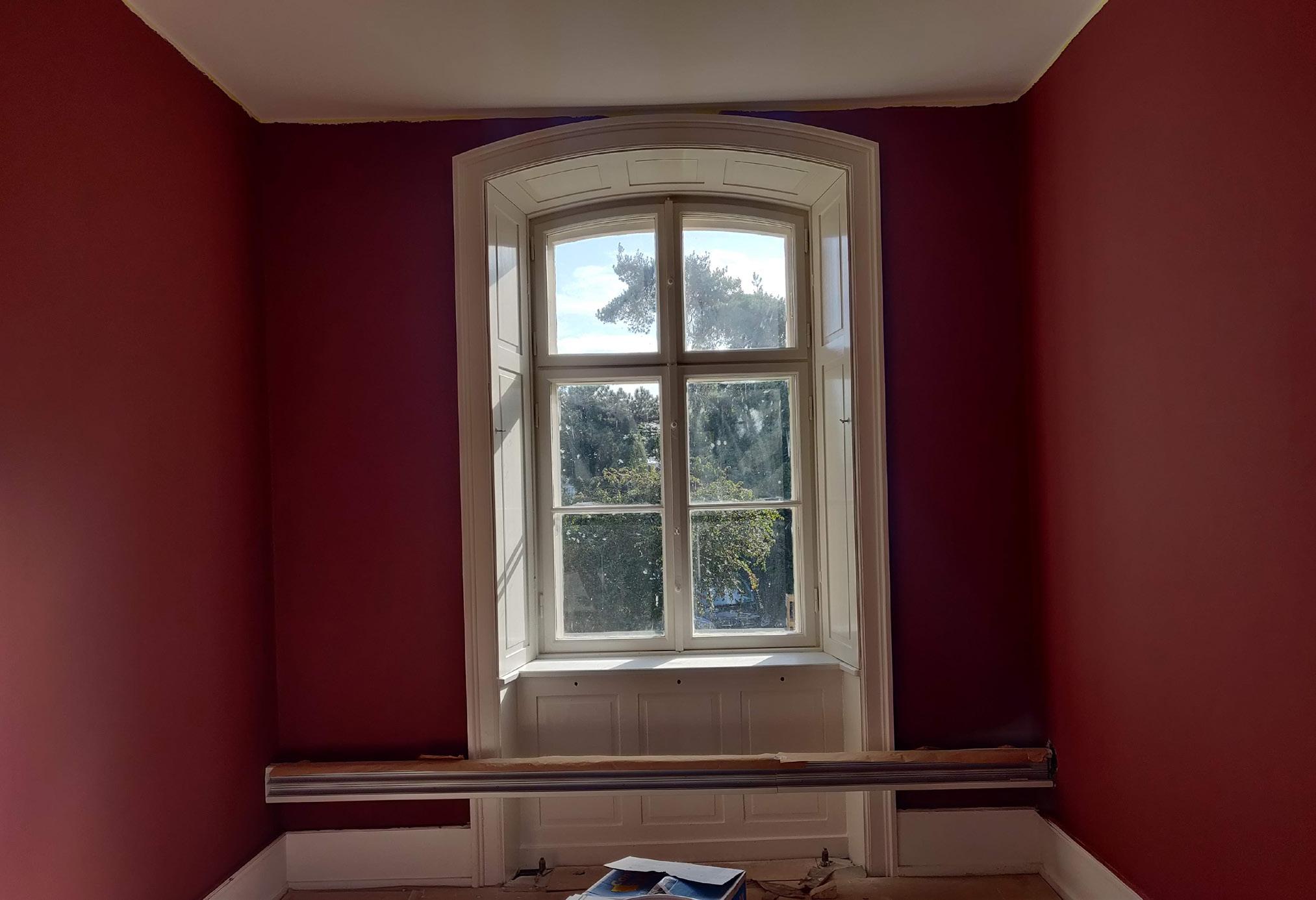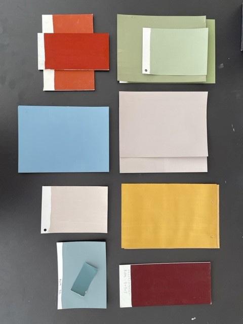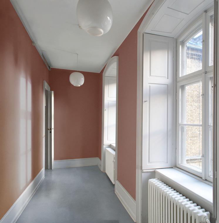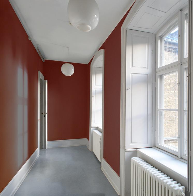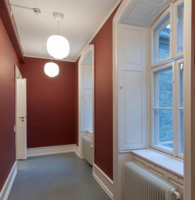 Arbejdet med farvesætning af huset har i høj grad udviklet sig i løbet af projektet. Indledningsvis har den grundige farvearkæologiske undersøgelse hjulpet med en forståelse af hvordan farver aktivt har været brugt til at underbygge bygningens særlige funktioner. I arbejdet med transformation og restaurering har vi overvejet at nytolke farvesætningen, bl.a. for at imødekomme nutidens krav til dagslys på faste arbejdspladser. Særligt de små rum i mellemfløjene har været udgangspunkt for en dialog. Vi ønskede at binde rummene sammen med den røde farve, således at den oprindelige ruminddeling var aflæselig, men samtidigt skal rummene, der har henholdsvis nordvendte vinduer og lave mørke lofter, kunne rumme fremtidige arbejdspladser, hvor man umiddelbart ønsker at trække mere lys ind. Der er lavet flere forsøg med at nedtone den mørke Dodenkop til en lysere rød i samme kulør. Til denne proces har vi brugt simple visualiseringer som værktøj – både ift. overvejelser om nyfortolkning af farvepaletten, men også overvejelser om genetablering af imitationsmaling samt farvesætning af træværk og andre detaljer.