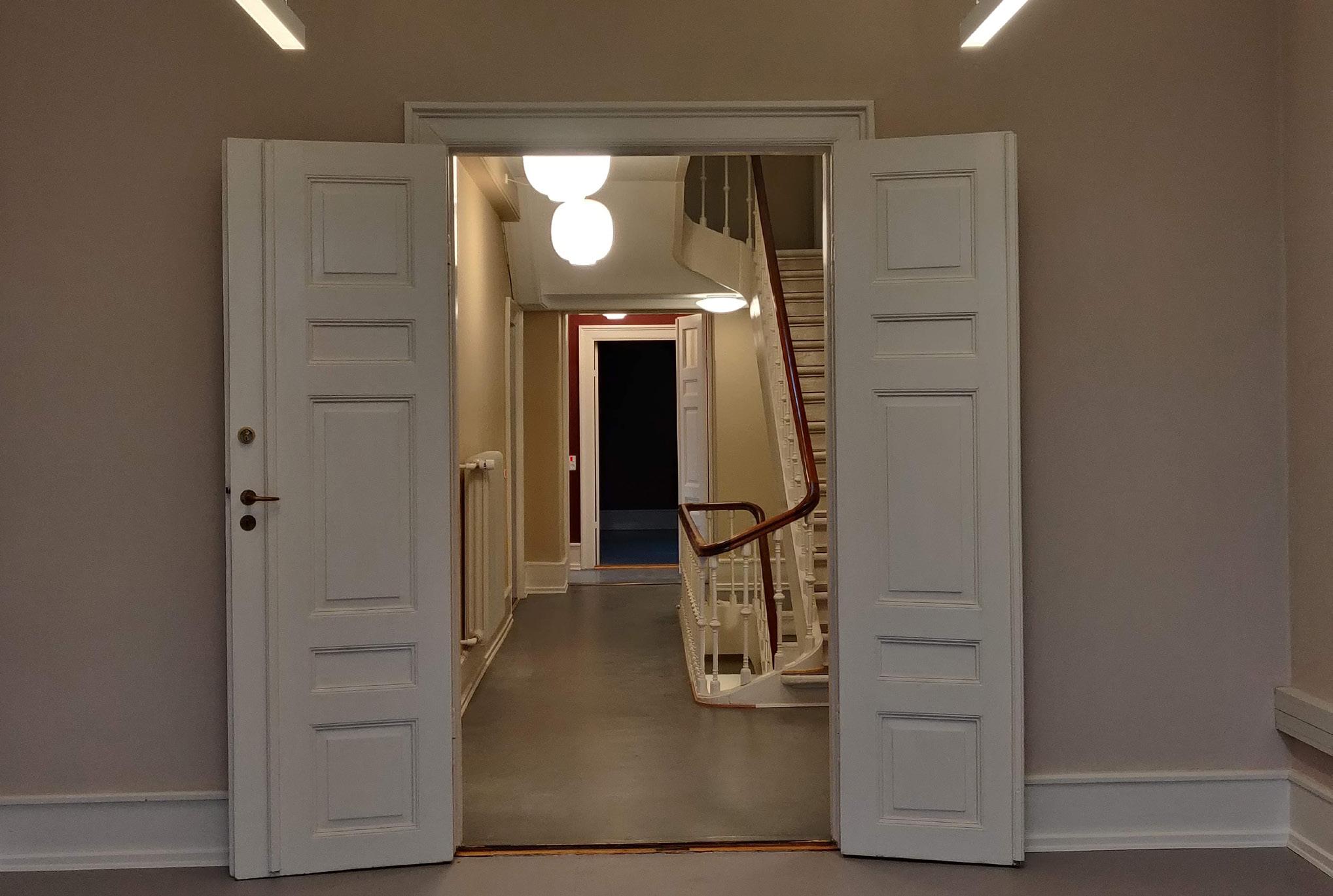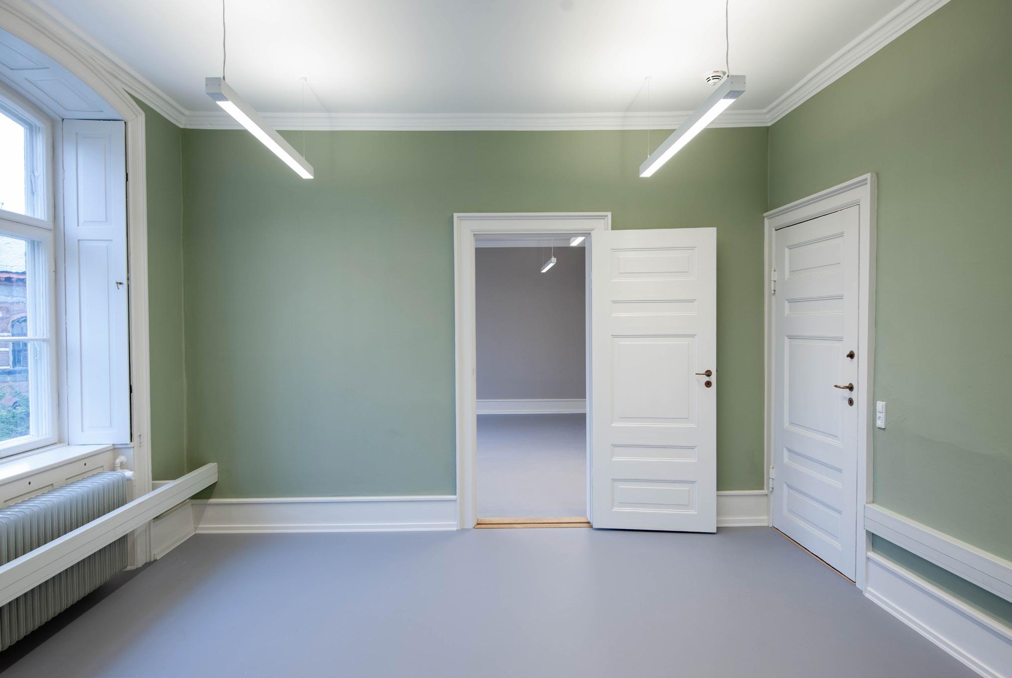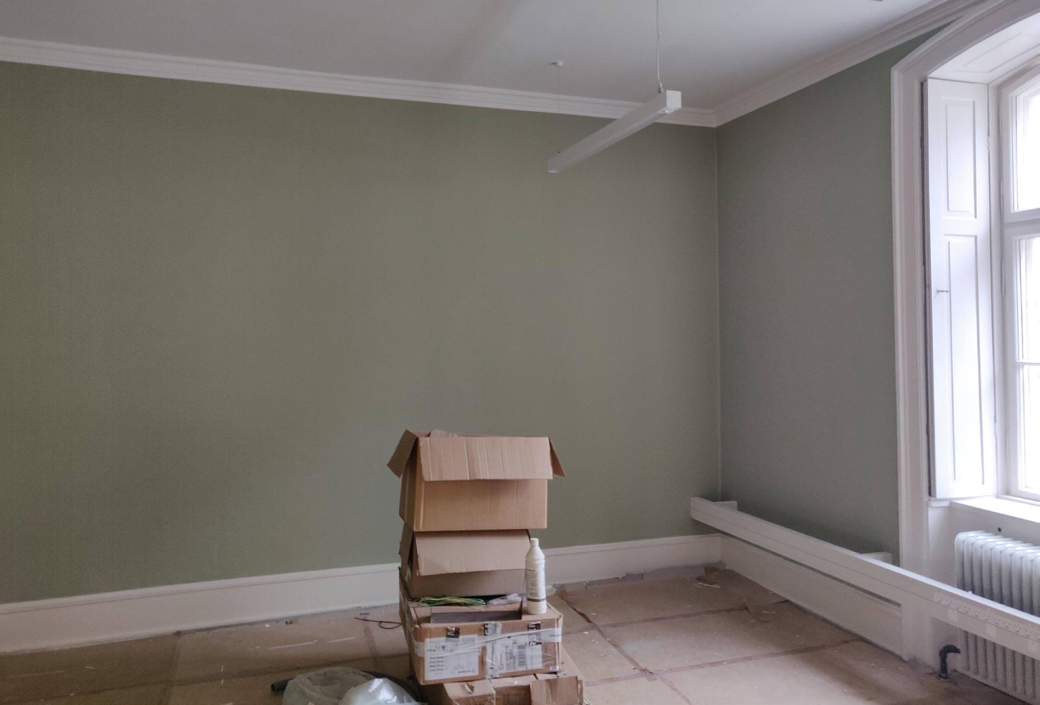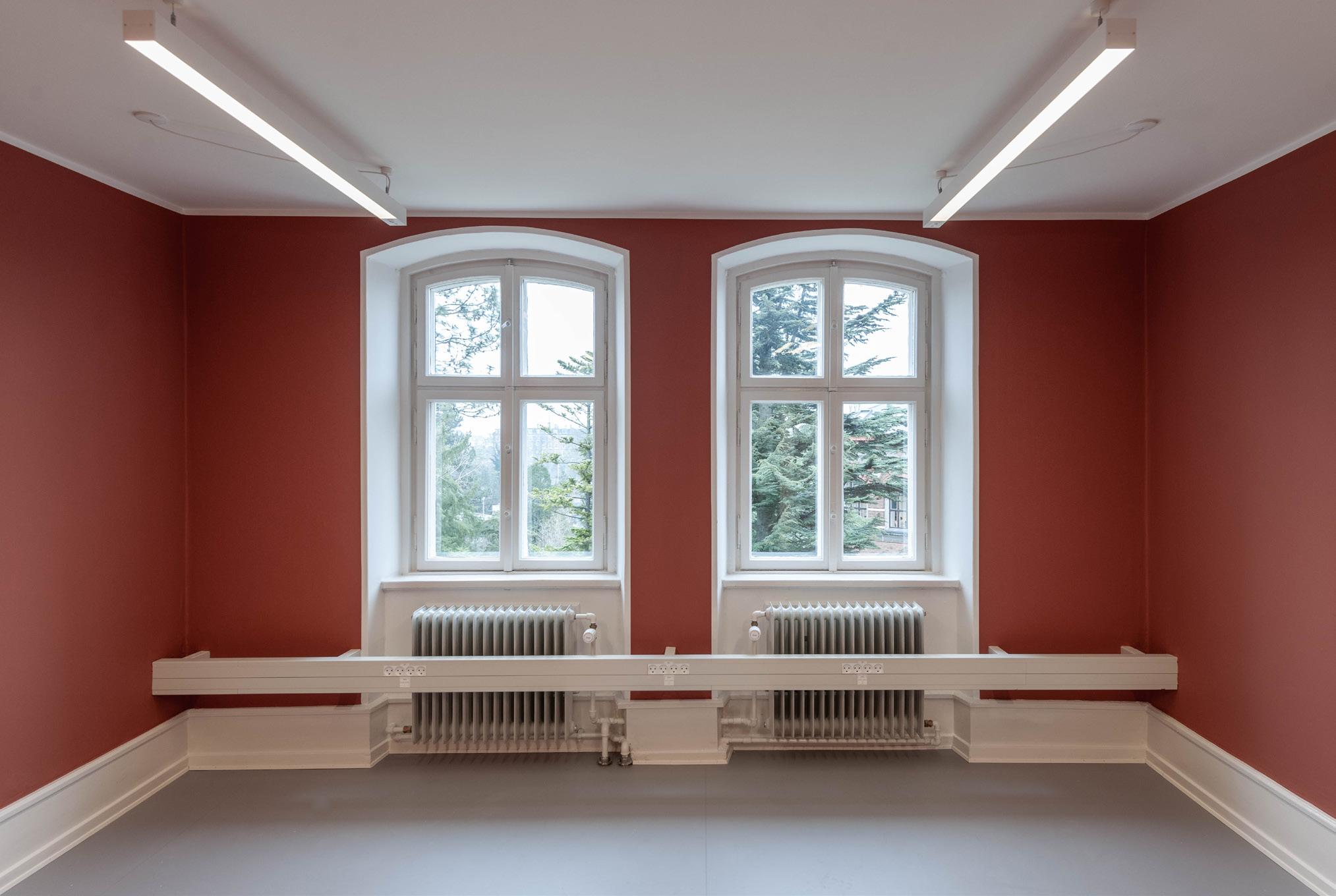 Arbejdet med farvesætning af huset har i høj grad udviklet sig i løbet af projektet. Indledningsvis har den grundige farvearkæologiske undersøgelse hjulpet med en forståelse af hvordan farver aktivt har været brugt til at underbygge bygningens særlige funktioner. I arbejdet med transformation og restaurering har vi overvejet at nytolke farvesætningen, bl.a. for at imødekomme nutidens krav til dagslys på faste arbejdspladser. Særligt de små rum i mellemfløjene har været udgangspunkt for en dialog. Vi ønskede at binde rummene sammen med den røde farve, således at den oprindelige ruminddeling var aflæselig, men samtidigt skal rummene, der har henholdsvis nordvendte vinduer og lave mørke lofter, kunne rumme fremtidige arbejdspladser, hvor man umiddelbart ønsker at trække mere lys ind. Der er lavet flere forsøg med at nedtone den mørke Dodenkop til en lysere rød i samme kulør. Til denne proces har vi brugt simple visualiseringer som værktøj – både ift. overvejelser om nyfortolkning af farvepaletten, men også overvejelser om genetablering af imitationsmaling samt farvesætning af træværk og andre detaljer.