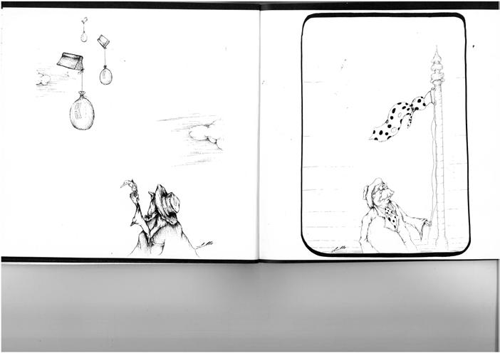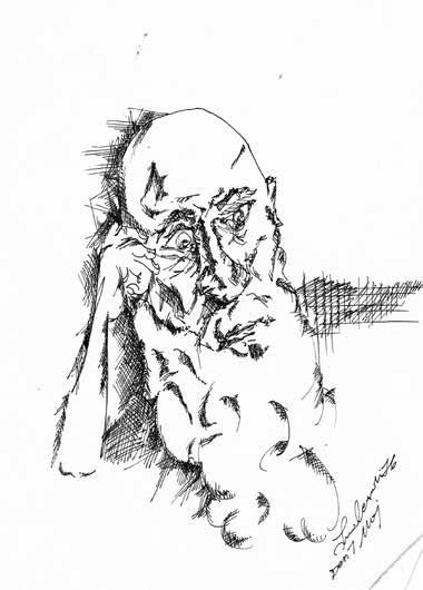 Writings in drawing with personally thought out caricature - grotesque imagerys, are not realized through what is obviously seen, rather then that, they show that which the author himself imagined and knows. The goal is not to draw characters acording to a certain model, rather then that, through realiscital forms, these feature typified characters depict in an ironical and sarcastic manner different meanings of limitations and weaknesses in human nature. The element of the ugly and humorous, which has no brightness to it, is dominearing through a rather serious tone in the manner of depicting the thought and awareness of human kind existence, by getting closer to black humor in expressing that which is conditioned from living a modern life. Those are robust figures with a typified character, who through certain modifications classifiy into another concept of iconographical content. The ugly and pretty are legit aesthetical categories, when in contribution to an idea and expression of the drawing. Smilevski builds strong and expressive grotesque figures and objects, that are steadily positioned in an imaginery modified, to the complementary environment of his drawing, space. The written drawings of Smielvski are simply componed with a symbolic clarity, or with a more complexed idea, which leads up to one goal: mocking mankinds distort reality, moving through a space inbetween personal and general situations and conditions. A dark tone is noticable in all of those scenes that comprise the realty of the problem in which nothing is that black, and in which a constancy of form breezez in, plotting the elements towards the surreal, as to depict auras, paradoxal relations, as well as the many varietes of mankind stupidity. Vasilye Smilevski forms spiritually and creatively during