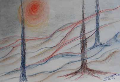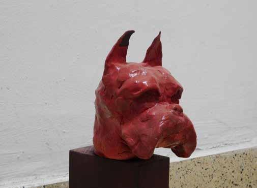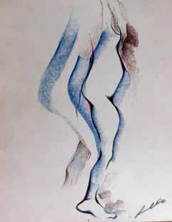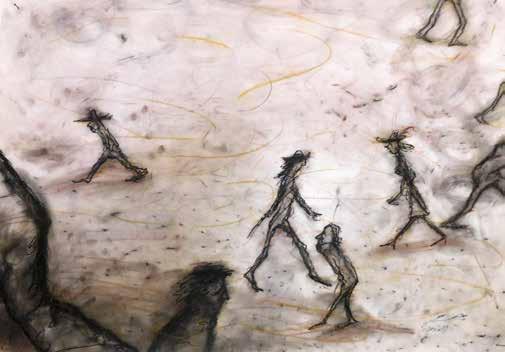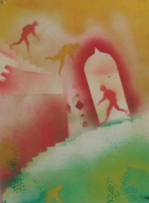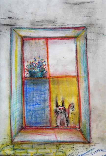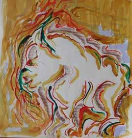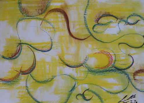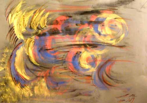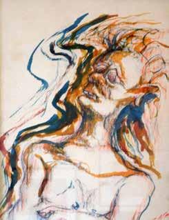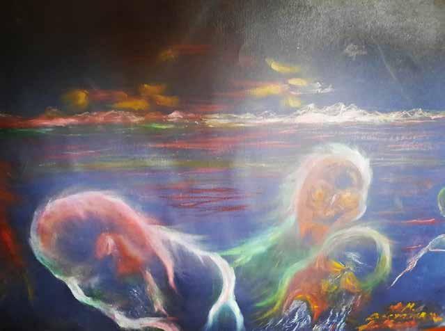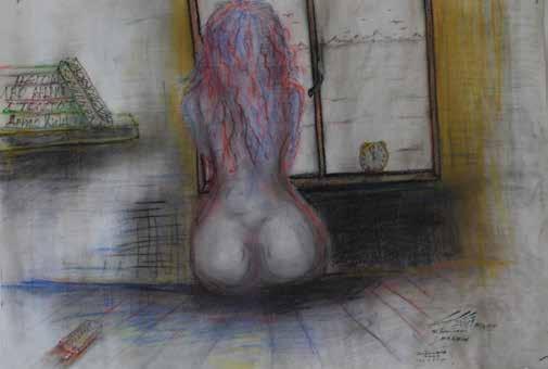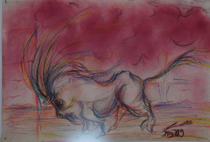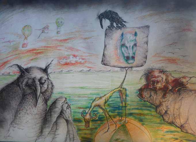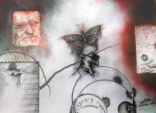 dark zones in his psychological nature, a vampire lurks behind, and Russian churches are noticeable from the dark gamma shadows. Munch’s Skrik, as a symbol of fear and pain of the 20th century, wraps up imagery of man’s troublesome nature. This painting, colored in dark greyish tones on the horizon, depicts a dog’s head with several faces and humane eye expres sions. As a part of the painting’s composition, represented on a painted wooden board. The artist is famous for his particular relation towards nature, especially animals; that is why bird and animal heads often meet up as a part of his artistic expression. Proof of the priorly written is the painting “Hell” from August 2014, which illustrates a monstrous iconography consisting of skulls, evil expression birds, human figures, faces of wise men, and a shepherd in the role of the bad omen warning messenger. Even in the painting “A woman’s act,” animalistic erotic suggestions are denoted through a stylized woman’s act transforming into a dog’s body. Smolenski is one of those authors who looks over the violence and evil in the World. Without fairy tales, he moves hallucinogenic between dreams and reality, daytime and night. Smilevski draws unusual characters with a psycholog ical expression of an uncalm mood, using a spontaneous line in intense colors (mainly pastel) following his biorhythm. In his other paintings, be sides human faces, predator birds emerge, such as a crow attacking some one’s head (a symbol of nightfall over man). The viewer senses tension in the artist’s free iconographic ideas. They depict ugly hybrids of monstrous ly presented men and animalistic characters, sending a direct message: we live in a cruel, satanic World. At the same time, there is no such devil or monster that could symbolize our time. How many times should Munch’s “Skrik” thunder strike? Or did Bacon’s “Scream” break apart so that painters accurately interpret this nightmare time we live? Smilevski has realized a series of paintings performed with a lively line and fierce colors, motivated by inner tension and anger, stylizing shapes to the border of disfiguration. He has realized paintings with watercolors and pastels due to his artistic temperament, partner’s gestures, and some “painters’ anger.” A half-fig ure shows out of somewhere and impulsively destroyed shape, throwing out the elements of details and perfectionism in the interest of a com