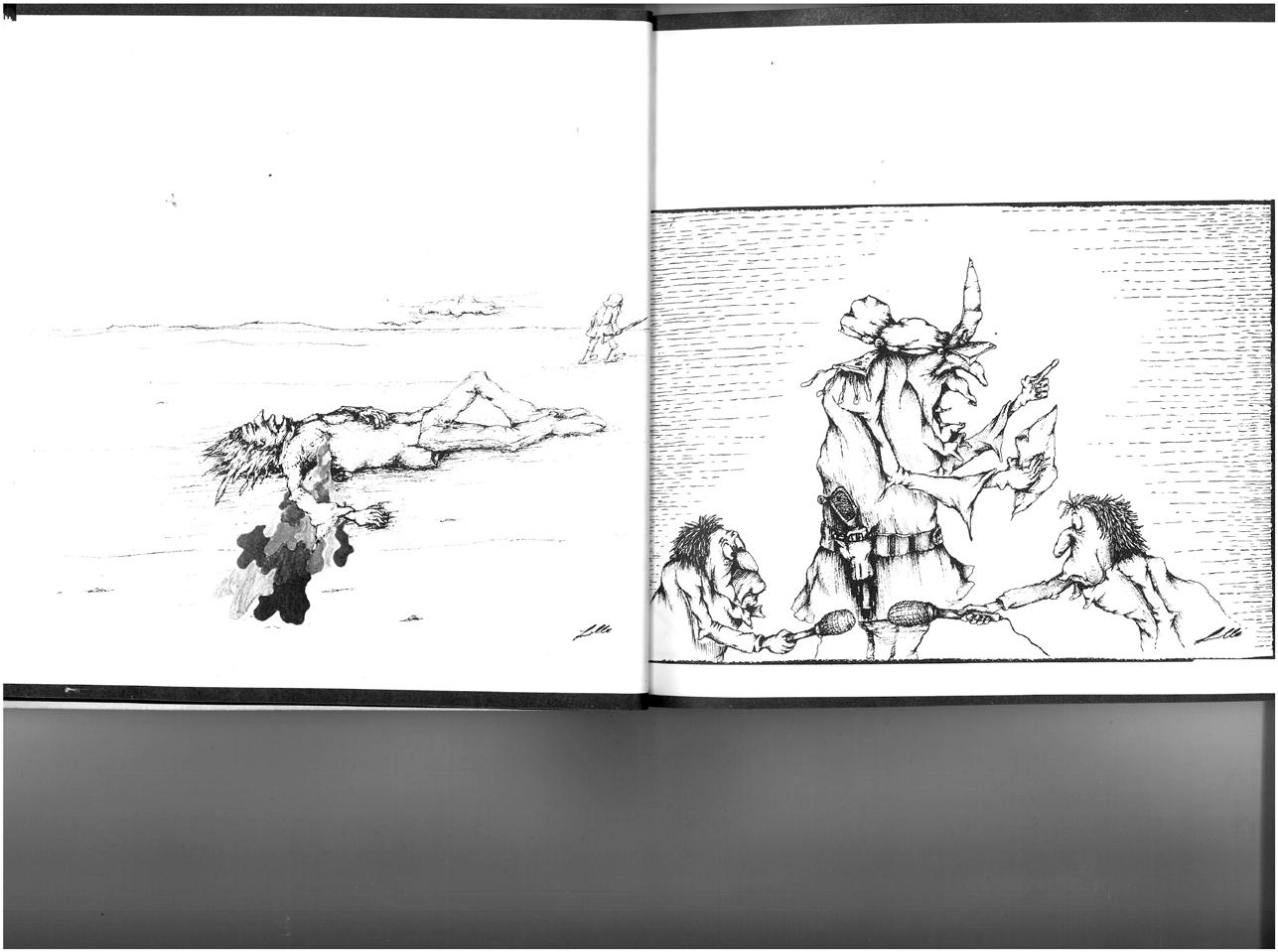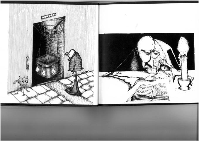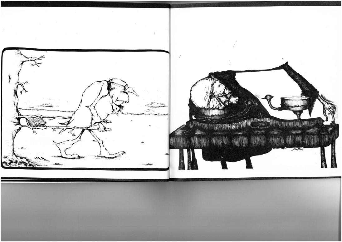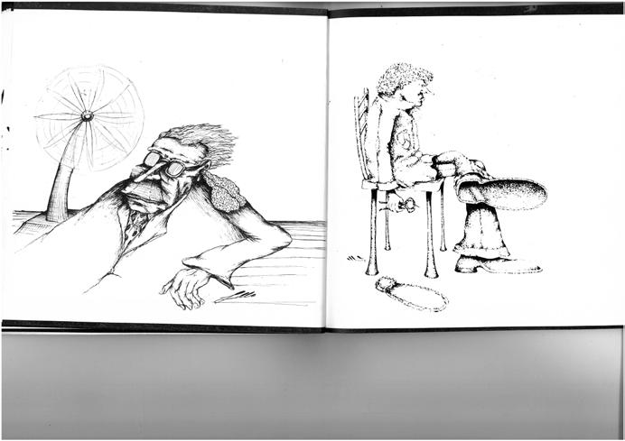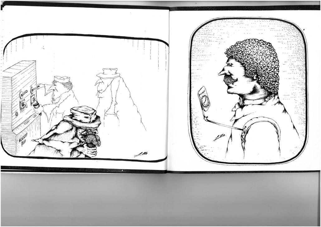 Writings in drawing with personally thought out caricature - gro tesque imagery, are not realized through what we see; instead, they show what the author himself has imagined and known. The goal is not to draw characters according to a specific model. Smilevski, somewhat, through natural forms, these feature typified symbols depict different meanings of limitations and weaknesses in human nature ironically and sarcastically. The element of the ugly and humorous, which has no brightness, is domineering through a rather severe tone in depicting the thought and awareness of humankind’s existence by getting closer to black humor in expressing that which is a form of living a modern life. Those are robust figures with a typified character, which classify into another con cept of iconographical content through certain modifications. The ugly and pretty are legit aesthetical categories when contributing to an idea and expression of the drawing. Smilevski builds strong and expressive grotesque figures and objects positioned in an imaginary modified to the complementary environment of his drawing, space. The written drawings of Smielvski are composed with a symbolic clarity or a more complex idea, leading up to one goal: mocking humanity’s distorted reality, moving through a space between personal and general situations and conditions. A dark tone is noticeable in all scenes that comprise the problem’s exis tence; the consistency of form breezes in, plotting the elements towards the surreal to depict auras, paradoxical relations, and the wide varieties of human stupidity. Vasilye Smilevski forms spiritually and creatively during the rebellious years of rock and pop music culture, in a time of new theo retical and artistic realizations that announced and created circumstances