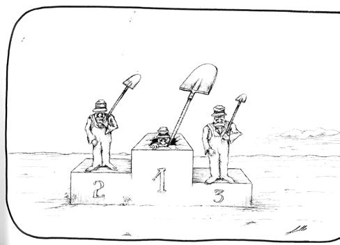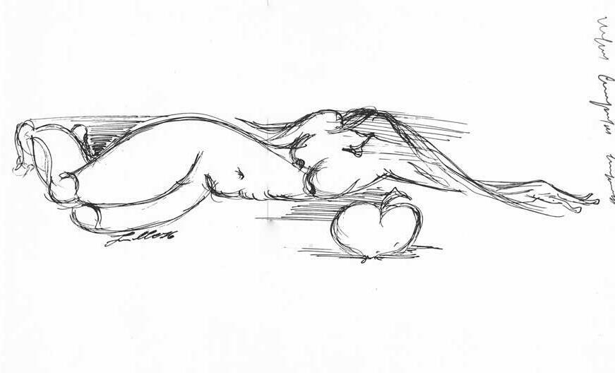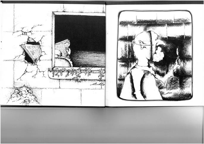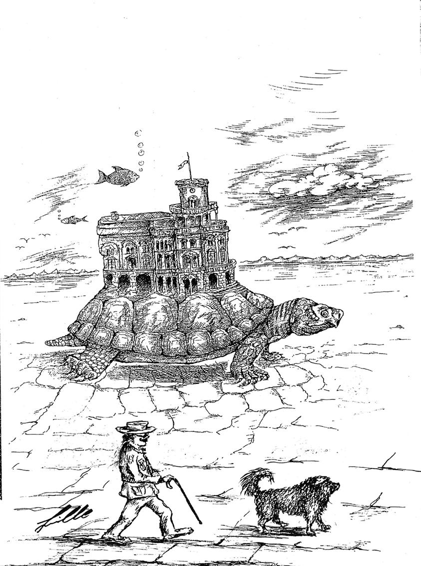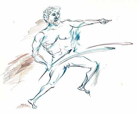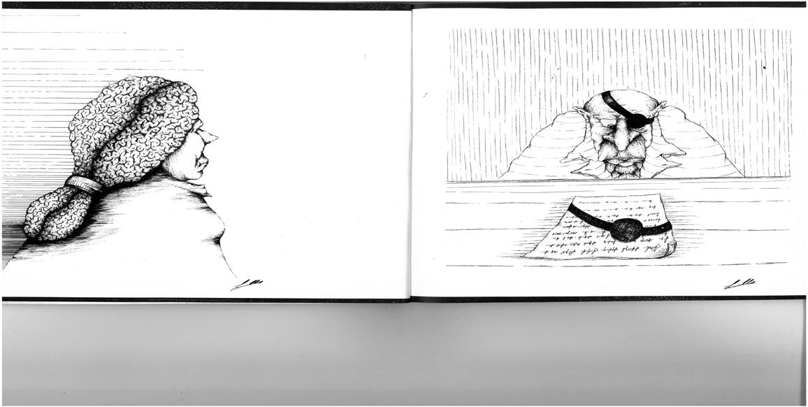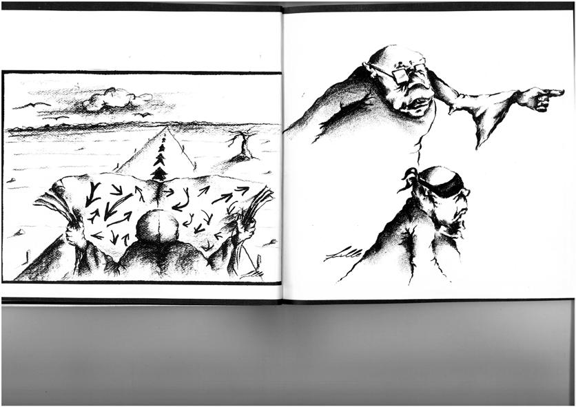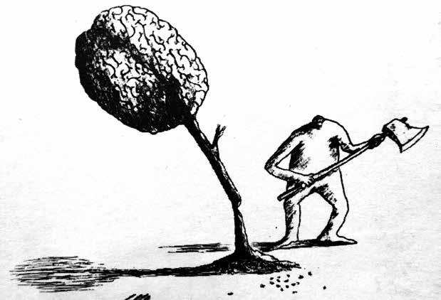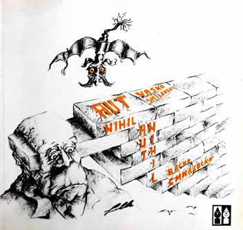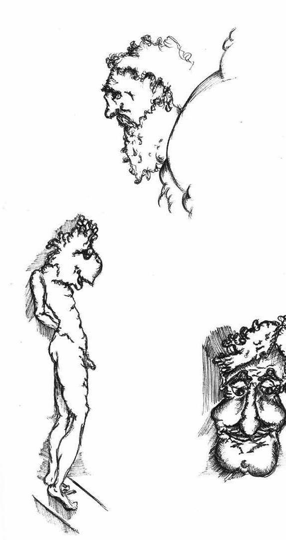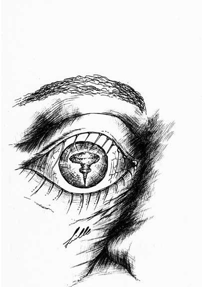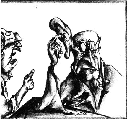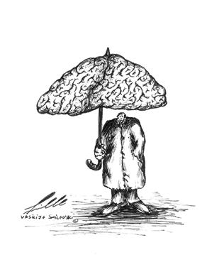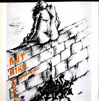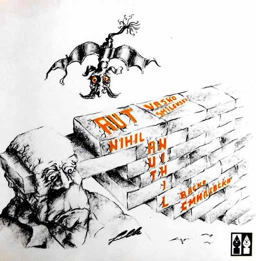 Different themes and motifs are presented in Smilevski’s drawings, iconographically variant, kindred in style, with comprehensive content and messages, but puzzling to an extent. The symbolic element of arrows is present in some periods and movements of the World’s Avant-guard and his opus. In his caricatures, pointers are present as an element with some domineering meanings or graphic-content connotations. The motif of hu man stupidity and limitations threads through his mockery - grotesque written drawings, as the theme of “from our mind we suffer” is represent ed in the works of significant scientists and artists. The front cover of his book “Aut Nihil” illustrates a grotesque character with a brick shoved in his head, not deviously suggesting man’s stupidity. The author reacts to human stupidity with rage, symbolically choosing the theme of human