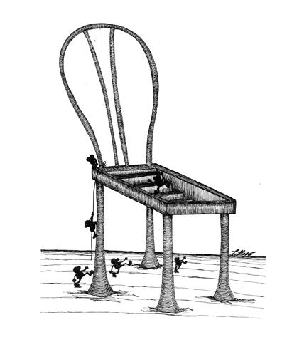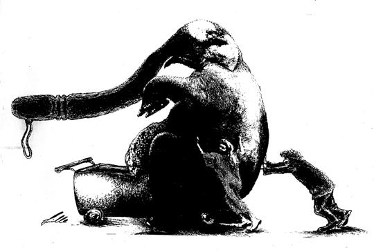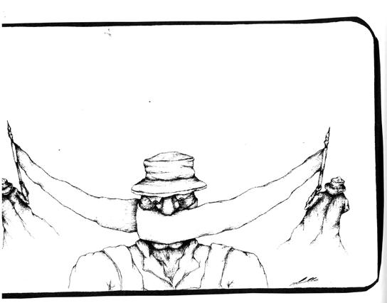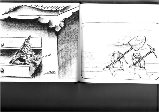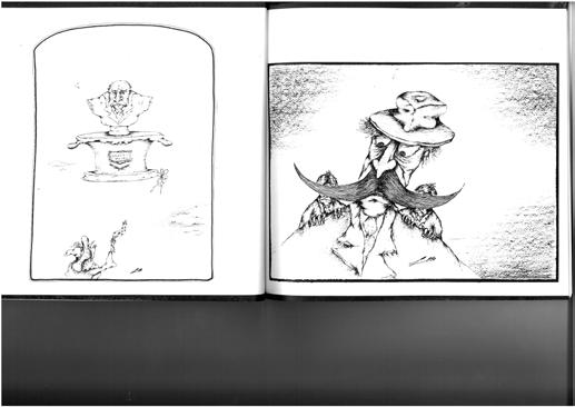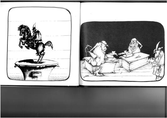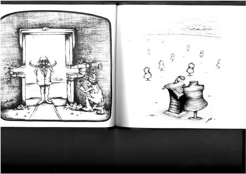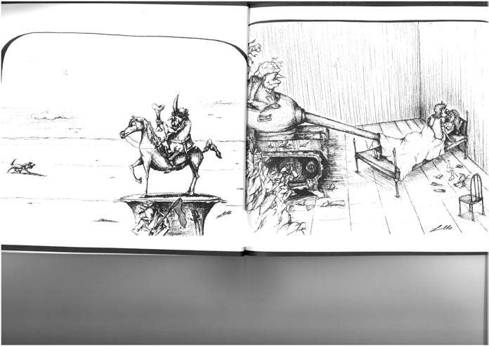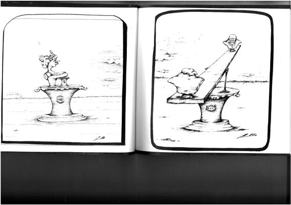 (with no words) which tells us about his interesting in creating strip art, as well as in drawing synopsys for animated film. He uses a wide spectrum of motives with symbolic and idea meanings or methaphorically articulating in different relations and compound elements: brain; mask; statue; flag; platform; armchair; bone; cow; dog... That choice of elements and procesing them out in a specific manner, confimrs the artis’s curiosity and contribution to happenings in life with a universal meaning. The art of Smilevski’s written drawings consists it’s own law of creation, subjcetively objectifying the articulation of his ideas, motvated from caricature - grotesque expressions of different human conditions, situations and weaknesses. The caricaturist is an engaged artist in case he suggestively depicts essential questions and problmes of mankind existence. Smilevski, most often classicaly builds a more complexed composition from different elements, as to point out in a cruicial moment, ideas and messages aimed towards the motif of absurdity and stupidity, for which there is no solution. He creates written drawings which are an expression of his temperament and mental work, recognizing not often an inexplicable configuration of spirit, a certain kind of a suggestive hidden curve of the mind.