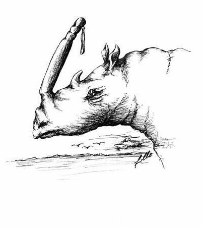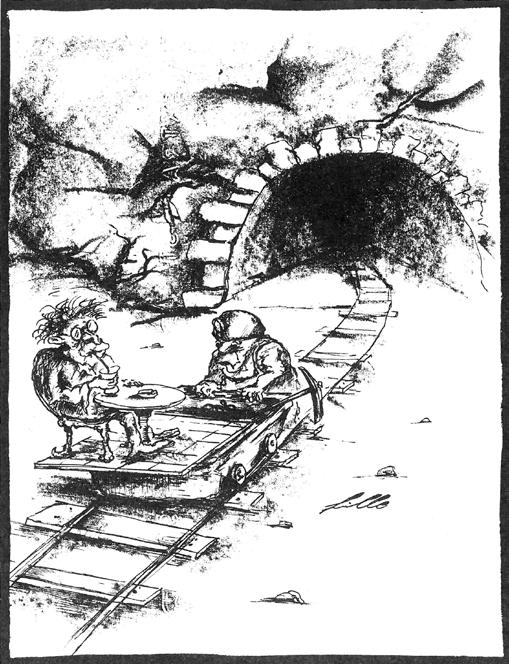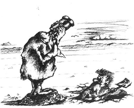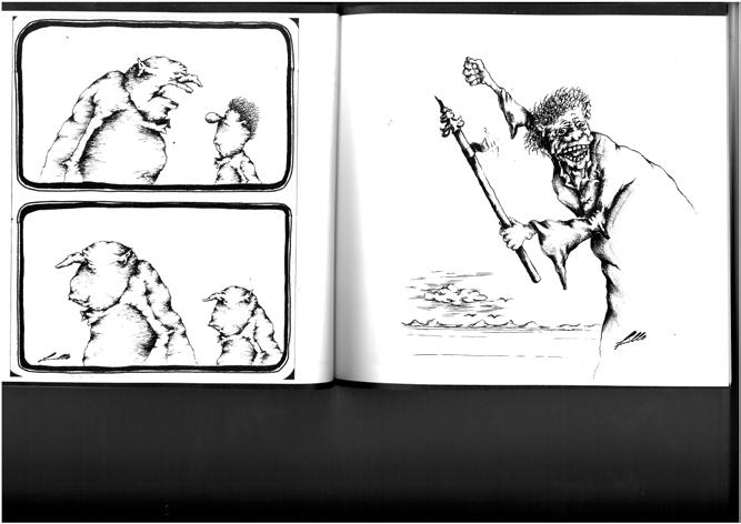 од карикатурата односно сатирата. Смилевски не црта џинови, чудовишта и фантастични суштества колку и да произлегуваат