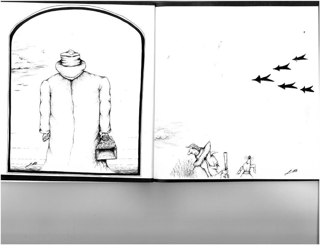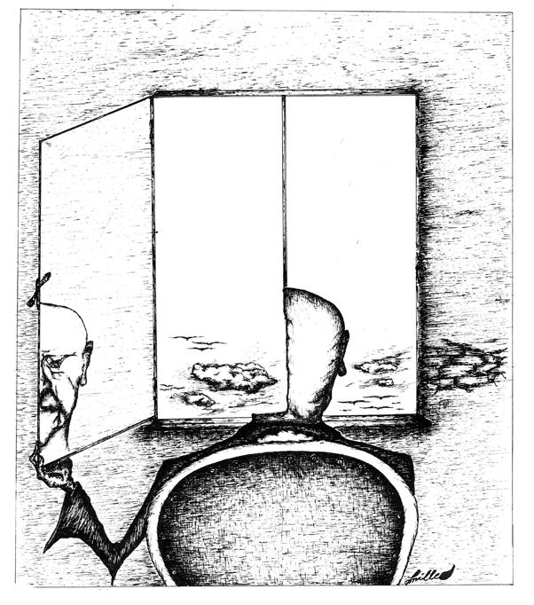 Different themes and motifs are represented in Smilevski’s drawings, iconographically variant, kindred in style, with a comprehensive content and message, but puzzlesome to an extent. The symbolic element of arrows is present in some periods and movements of the World avant garde, as well as in his individual opus. In his caricatures, arrows are present as an element with some dominearing meanings or graphic - content conotations. The motif of human stupidity and limitations, threads through his caricature - grotesque written drawings, as the theme of “from our mind we suffer” is represented in the wokrs of significant scientists and artists. Тhe front cover of his book “Aut Nihil” illustrates a grotesque character with a brick shoved in his head, not devoiously suggesting man’s stupidity. The author reacts to human stupidity