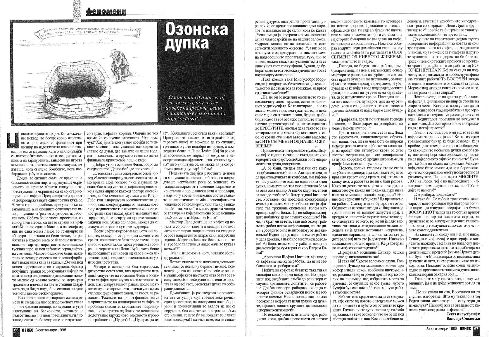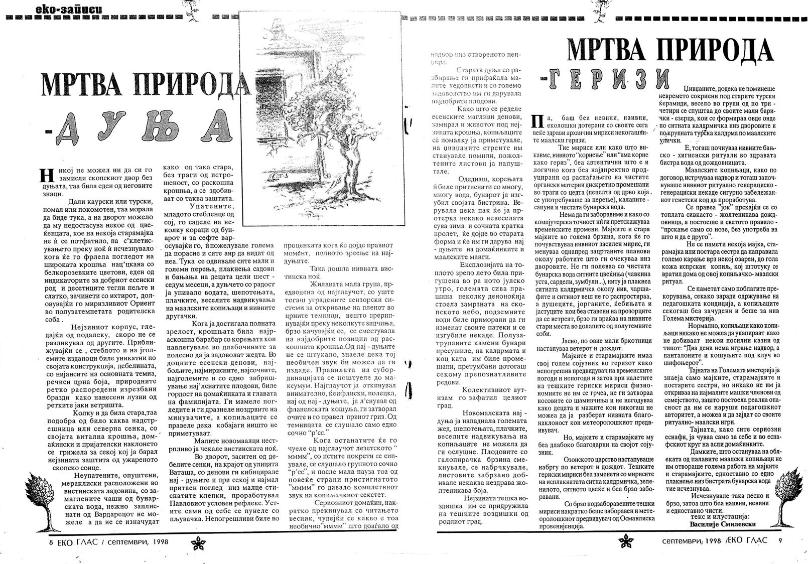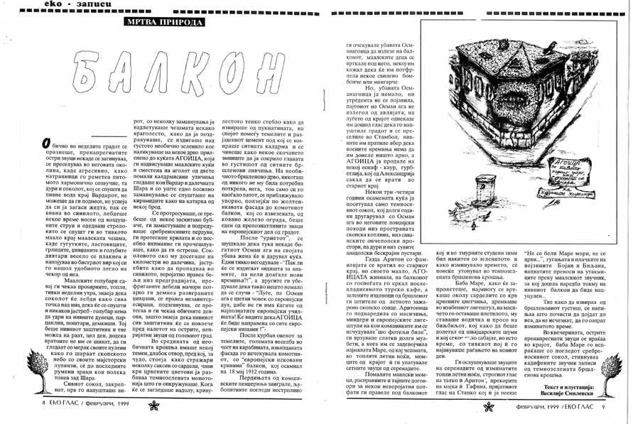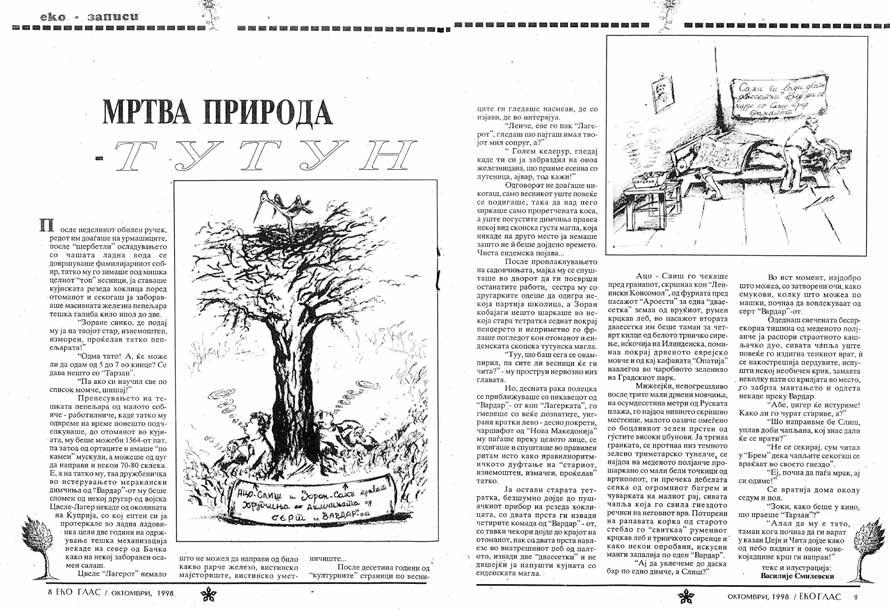 though he was not open to political confrontations and opportunism. He has fulfilled personal handwriting in his caricature - grotesque writing in drawing (as the artist himself names the caricature works). Moving from between experiences surrounding him towards the symbolic meaning behind the idea and morally sustainable themes denote anomalies in human nature and society (with stupidity and ecology as “eternal” themes). Even today, specific ideas of his art realizations are impressive in their ac tuality and quality. Smilevski has a restless and curious author’s nature, who realizes himself in the fields of painting, photography, and sculpture, and nevertheless, his columns or text writings are caricaturally illustrated. From the beginning, on the author’s behalf, I had the freedom to select his work through my critical observations and judge our society’s mentality, which is not a standard feature - since vanity is a domineering feature, despite the quality of the artwork. He has published his drawings and writ ings alongside other Macedonian and YU caricaturists such as Dusan Lud vig, J.Vlahovic, M.Mihatov, Vasika Teknes... He has formed the Macedonian cultural scene and public speech with his text writings, alongside other famous society critics and political and cultural ambiance in the Macedo nian and ex-YU territory. His drawings evolve from simple linear solutions and thematical preoccupations to an artistically worked-out solid form. He modelized them with dots of different sizes and densities, creating