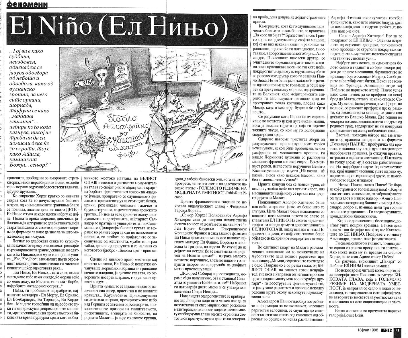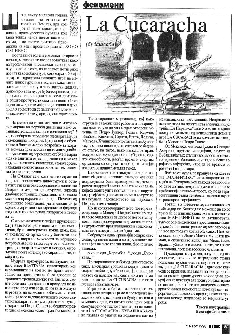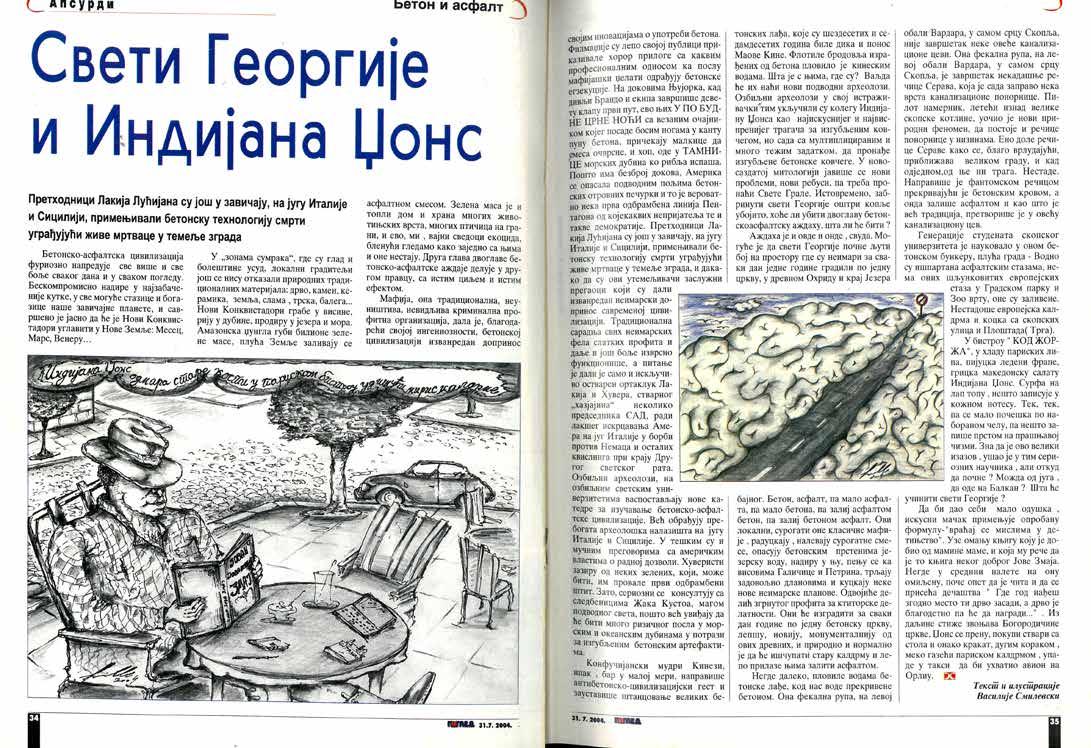 though he was not open to political confrontations and opportunism. He has fulfilled personal handwriting in his caricature - grotesque writing in drawing (as the artist himself names the caricature works). Moving from between experiences surrounding him towards the symbolic meaning behind the idea and morally sustainable themes denote anomalies in human nature and society (with stupidity and ecology as “eternal” themes). Even today, specific ideas of his art realizations are impressive in their ac tuality and quality. Smilevski has a restless and curious author’s nature, who realizes himself in the fields of painting, photography, and sculpture, and nevertheless, his columns or text writings are caricaturally illustrated. From the beginning, on the author’s behalf, I had the freedom to select his work through my critical observations and judge our society’s mentality, which is not a standard feature - since vanity is a domineering feature, despite the quality of the artwork. He has published his drawings and writ ings alongside other Macedonian and YU caricaturists such as Dusan Lud vig, J.Vlahovic, M.Mihatov, Vasika Teknes... He has formed the Macedonian cultural scene and public speech with his text writings, alongside other famous society critics and political and cultural ambiance in the Macedo nian and ex-YU territory. His drawings evolve from simple linear solutions and thematical preoccupations to an artistically worked-out solid form. He modelized them with dots of different sizes and densities, creating
