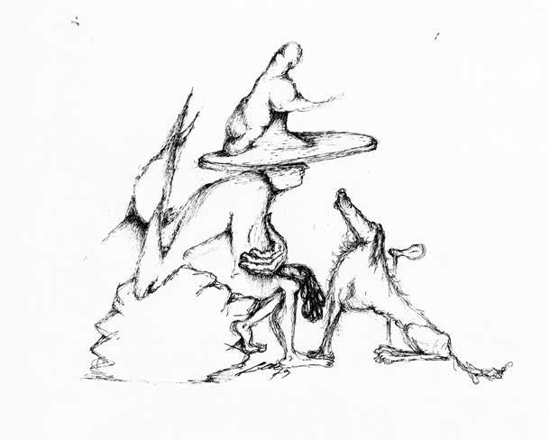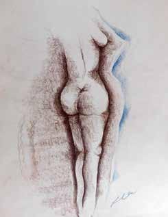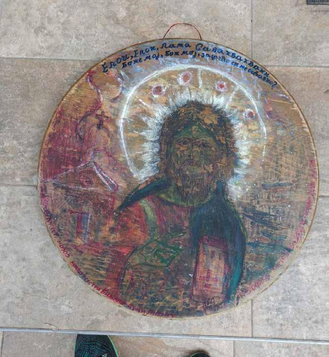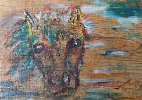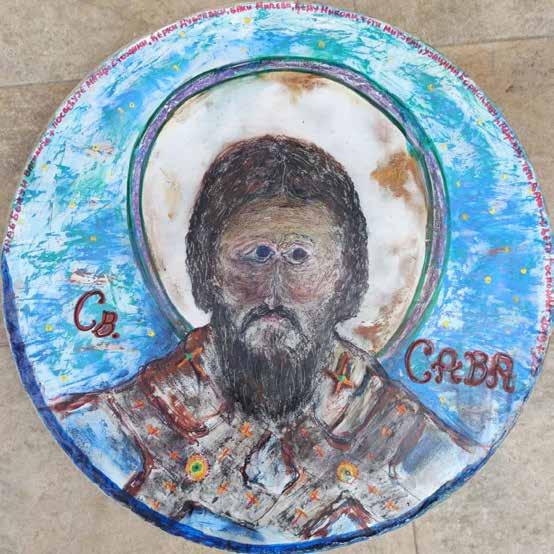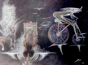 prehensive and free gesture, to which there are elements of aggression and pleasure. He uses oil spray with automotive paint to depict a plane in his other works. Vasilye Smilevski controls the shapes of human forms and shadows he creates. These illustrations are dynamically positioned in a geometrically articulated space, confirming his artistic experimentation affinity by using different techniques and thematics. The painting “Cyclists” from 2016, painted in watercolors, automotive spray, and paint markers; “Cyclists” from 2019, drawn in pastel and gouache; in the same year, he created his other works such as: “No title,”; “Lyrical,”; “Landscape,”; “To my mother,”; “Two-faced,”; “Composition” with a motif of cypress woods. Smi levski draws on different paper and paints from old tables or chairs and furniture parts on wooden boards. He is not picky with his painter’s means and materials, but he works with every material available. He has painted several saints on wooden boards. Smilevski painted the image of “Jesus Christ” in 2019 in a darkened tone, so his painting of “Jesus” directs us to middle ages fresco - painting and iconography that differs from the western tradition, including in film art, Jesus is blue-eyed and blonde. Vasiliye Smilevski’s artistic imagery of Christ presents his personally thought-out writing. At the same time, in the manner of presentation and expression, it differs from the middle ages black icons, such as the icon from Struga (spe cific for its symbolic function). Great artists such as Bosch; Bruegel, Goya; Baudelaire, and Munch have processed works dedicated to the secretive zones of inner human life. The other saint character is Saint Sava from 2019, dedicated to the symbol of the Serbian Orthodox people, painted on a round wooden board with a diameter of 42cm. He painted birds such as “Owly” and miniature faces on small squares in the same year. The famous Cuban - Argentinian revolutionary Che Guevara was painted by Smilevski on a rectangular wooden board vertically positioned in 2019. Smilevski’s creative approach to drawing characters, figures and women’s acts with a controlled erotic suggestion is affective and temperamental, especially noticeable in the motif of the “Cyclists,” caught with horizontal lines that erase the object. Motifs in his drawings are expressive figures with gro tesque features, such as a horse, located in a landscape drawn in a simpli