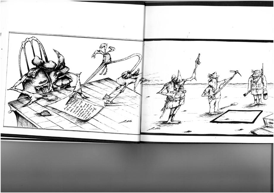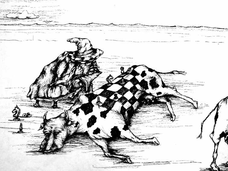 art and drawing Synopsys for animated films. He uses a broad spectrum of motives with symbolic and idea meanings or metaphorically articulating in different relations and compound elements: brain; mask; statue; flag; platform; armchair; bone; cow; dog. That choice of ingredients and pro cessing them explicitly confirms the artist’s curiosity and contribution to happenings in life with a universal meaning. The art of Smilevski’s written drawings consists of its law of creation, subjectively objectifying the ar ticulation of his ideas, motivated by caricature - grotesque expressions of different human conditions, situations, and weaknesses. A caricaturist is an artist engaging in essential questions and problems of humankind’s existence. Smilevski most often classically builds a more complex composition from different elements to point out in crucial moments ideas and messages aimed towards the motif of absurdity and stupidity, for which there is no solution. He creates drawings that express his temperament and mental work, recognizing not often an inexplicable configuration of spirit, a certain kind of a suggestive hidden curve of the mind.