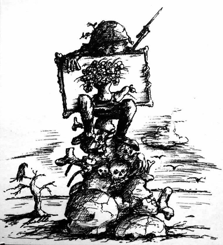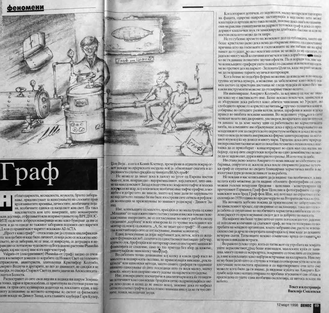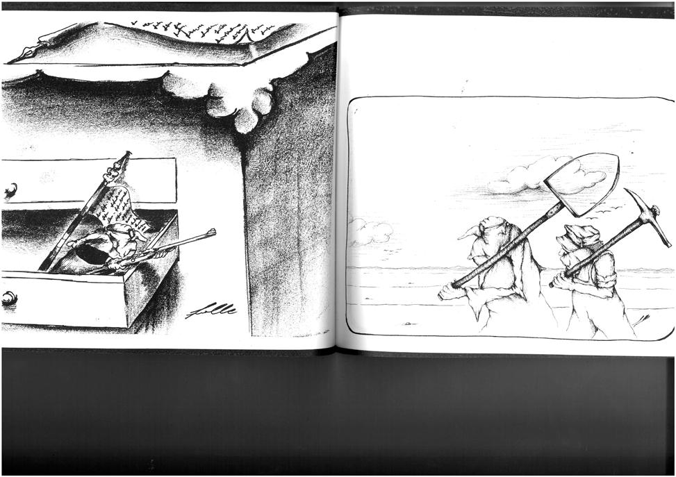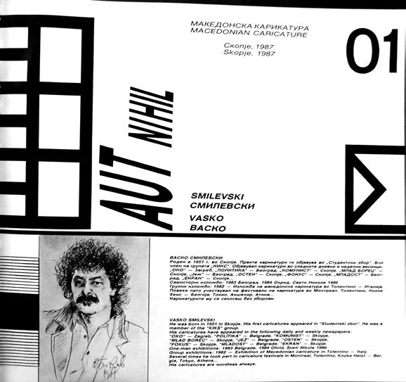 Vasiliye Smilevski1 (Skopje ‘51), a caricaturist in the majority part of his creating and afirmation, which includes illustration and graphic - art design editing throughout many years of his work. He has acomplished a vast and mature opus in the rebellious and quality periods of art during the 70s and 80s, as well as in latter years. A sincere creator and experimentator, who could not have been left unnoticed from the critics eye. Even in the dominearing and significant period of “YU cultural area (in which socialism was called