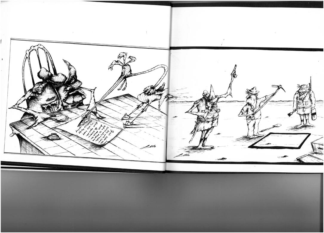 insectofaced grotesque figures positioned in a deserted, indeterminate terrain. His work with that content reffers to different themes and problems closely tied with evil and agression, monsters, the aspect of crazyness... His motifs have an outcome in reality, as well as in the subconsciouss scream, but even in social environment conditions, with fear and doubt in the World order.