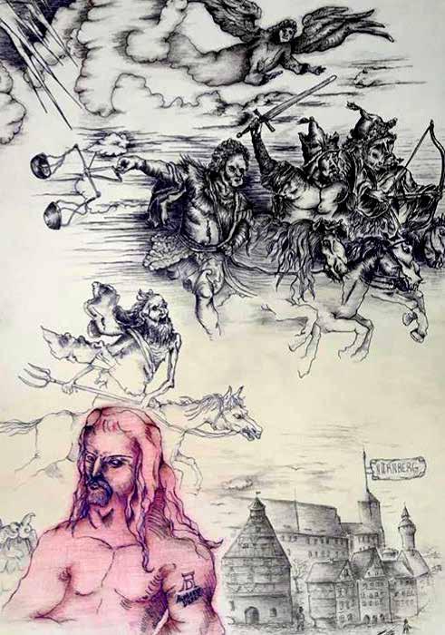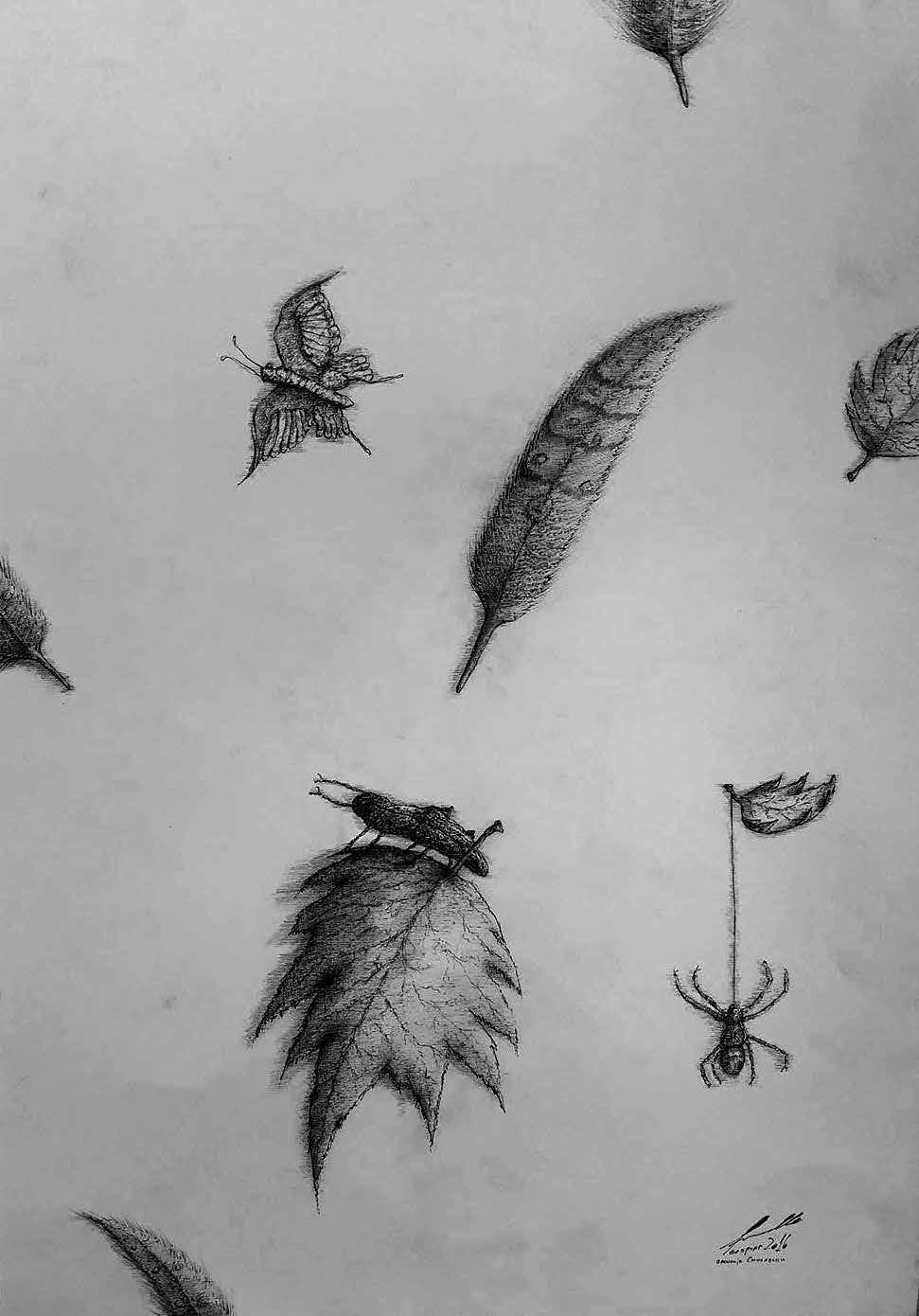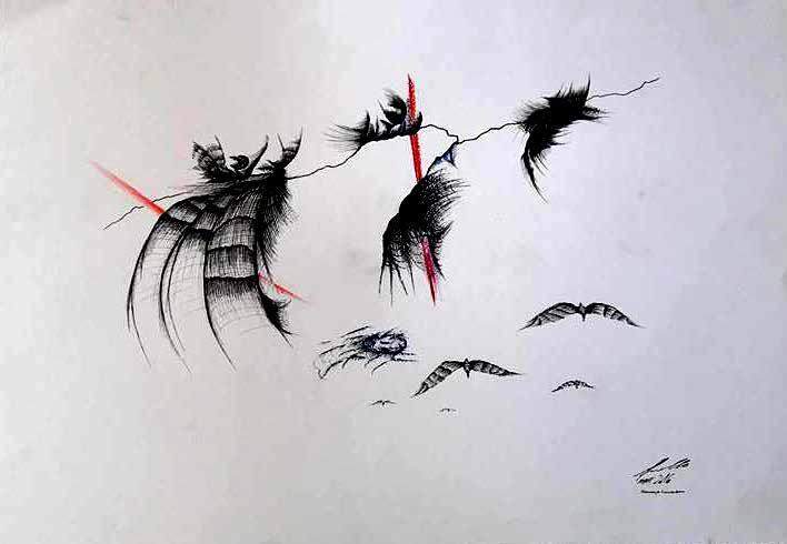 fied manner. “Black walkers” 2019, drawn with pastel and water markers, represents a group of people - shadows. Every man for himself walks out of nowhere towards an obscure direction, insect-faced grotesque figures positioned in a deserted indeterminate terrain. His work with that content refers to different themes and problems closely tied with evil and aggression, monsters, and the aspect of craziness. His motifs have an outcome in reality and the subconscious scream, but even in social conditions, with fear and doubt in the World order.