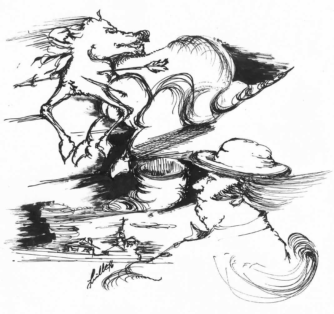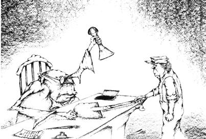 the rebelious years of rock and pop music culture, in a time of new theoretical and artistical realizations that announced and created circumstances for the development of postmodernim, that has not been precisely definded yet. Informatic technologies and opportunities of the new media were useful even for Smilevski’s creations. A lot of quotes, for the conditions in the Macedonian society, can be mentioned, depicting this time of deep crysis, such as several lyrics from Allen Geinsberg’s poem “Howl” from “Howl and other poems” which through their suggestiveness, are currently important: “I saw the best minds of my generation destroyed by madness”. The drawing’s robust figures, are sometimes drawn with animalistic features in a diagonal position that changes the element relations in the drawing, but not suggesting staticness. In Smilevski’s caricature - grotesque drawings, not often, figures of men realize some kind of idea in relation to animalistic creatures. We have to note out that he has a special bond towards animals, especially dogs, condoling in that way with nature and eco problems. The written drawings of Smilevski are one of a kind crititcal graphic comments of mankind’s nasty behavior. Among other famuos authors who denote those themes are: J. Vlahovic; but Smilevski as well, who creates in a time of technological and ideological allienation, when man is frustrated and closed off (in a time of re evaluating the power of machinery, Lewis Mumford)4, especially after the student riots back in 1968 till 1984 and up untill the year 2000. Objectivity in Smilevski’s imagerys does not eliminate the irrationalities in human behavior ( the subconsciousness gives birth to monsters), he does not draw monsters, rather then that, he works with drawing creatures with improportions and imperfections, corelating between small and lagre extremities of the characters, who are either positioned in isolation or postured in an unconventional and blurry surroundings. Smilevski’s humor of thought is not easily noticable at first sight, rather then that it often brings us faceing up against a wall, cutting off stories with inexplicable mysteriousness, but humour in every sense and shape has something liberating in store for a man, and as such is analogue to spirituality and comics. Smilevski especially appreciates the following caricaturists: Stevo Starckovski; Vlado Jocic; Slavoljub Ignjatovic - Ignjat; Vladimir Borojevic; Gligor Kostovski; Lazo Plavevski... Smilevski has worked out several varietes of caricatures in three to four pictures