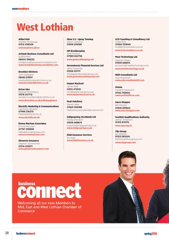 West Lothian Allied Irish Andrew McGeorge 01312 438006 www.business.aib.ie Avinash Business Consultants Ltd Sudha Mani 08000 399232 info@avinashbusinessconsultants.com www.avinashbusinessconsultants.com Brooklyn Kitchens John Gallagher 08082 819511 inspired@brooklynkitchens.co.uk www.brooklynkitchens.co.uk Driver Hire Rachael McWilliams 01316 247712 rachael.mcwilliams@driverhire.co.uk www.driverhire.co.uk/edinburghwest Electrify Marketing & Communications Lawrence Broadie 07966 216270 Please@electrify.me.uk www.electrify.me.uk Emma Maclean Associates Emma MacLean 07767 099858 hello@emmamaclean.com www.emmamaclean.com Glenavon Insurance Stephen Stornmonth 01314 432971 www.glenavoninsurance.com
