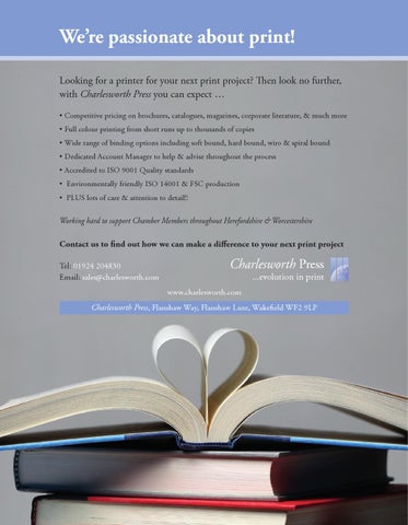 We’re passionate about print! Looking for a printer for your next print project? Then look no further, with Charlesworth Press you can expect … • Competitive pricing on brochures, catalogues, magazines, corporate literature, & much more • Full colour printing from short runs up to thousands of copies • Wide range of binding options including soft bound, hard bound, wiro & spiral bound • Dedicated Account Manager to help & advise throughout the process • Accredited to ISO 9001 Quality standards • Environmentally friendly ISO 14001 & FSC production • PLUS lots of care & attention to detail!! Working hard to support Chamber Members throughout Herefordshire & Worcestershire