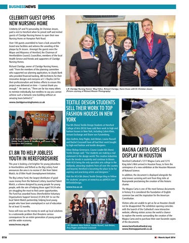 Alex Guthrie, Amy Pegler, Josh Bolam, Louise Russell and Rachel Cresswell have all had their work bought by high-end fashion and textile designers. Elinor Bishop-Greenacre, Course Leader BA (Hons) Textile Design said: “Our students are making a real statement in the design world. The creative industries buck the trends in austerity and continue to bloom. With HCA being the only specialist arts college in the midlands, attracting students from all over the country and beyond, Hereford is becoming the place to be for aspiring and practicing artists and designers.” Visit the HCA BA (Hons) Textile Design blog to follow the students’ progress at www.hca.ac.uk/HCA-Live/ BATextileDesign. www.hca.ac.uk