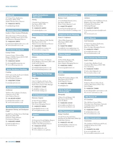 Ahha Ltd 257 Kings Drive, Eastbourne, East Sussex, BN21 2UR Audrey Fletcher-Price, Director T: +44(0)1323 501722 E: audz@adesign.ltd.uk Alexander Rose Ltd Garden & Patio Furniture Wholesalers Alexander House, 59 Victoria Road, Burgess Hill, West Sussex, RH15 9LE Paul Stammer, Managing Director T: +44(0)1444 258931 E: paul.stammer@alexander-rose.co.uk W: www.alexander-rose.co.uk All Leisure Group Ltd Luxury Cruises Lynnem House, 1 Victoria Way, Burgess Hill, West Sussex, RH15 9NF Jos Dewing, Director T: +44(0)1444 462103 E: j.dewing@allleisuregroup.com W: www.allleisuregroup.com Annie Davidson Coaching Coaching Old Copwood, Rocks Road, Uckfield, East Sussex, TN22 3PT Annie Davidson, Proprietor T: +44(0)7889 272560 E: annie@copwood.com Architecture Live Architecture Tall Trees, The Cylinders, Fernhurst, Haslemere, GU27 3EL Irene Gratton, Director T: +44 (0)1428 652018 E: info@architecturelive.co.uk W: www.arcitecturelive.co.uk Bowles Development Centre Management Training and Development Centre Sandhill Lane, Eridge Green, Tunbridge Wells, Kent, TN3 9LW Katherine Parker, Business Development Manager T: +44(0)1892 610600 E: katherine@bowles.ac W: www.bowles.ac