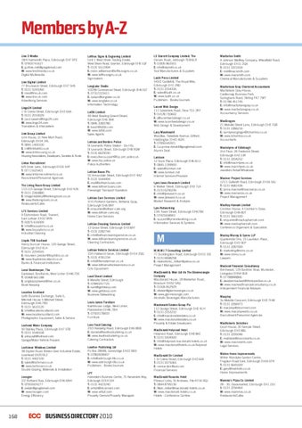 Members by A-Z Line 3 Media 18/4 Harrismith Place, Edinburgh EH7 5PE T: 07903741627 E: guthrie.neil@googlemail.com W: www.line3media.co.uk Digital Multimedia Line Digital Limited 77 Brunswick Street, Edinburgh EH7 5HS T: 0131 5243260 E: ross@line.uk.com W: www.line.uk.com Advertising Services Lingo24 Limited 1 St Colme Street, Edinburgh EH3 6AA T: 0131 2010029 E: paul.sawers@lingo24.com W: www.lingo24.com Translators & Interpreters Link Group Limited Link House, 2c New Mart Road, Edinburgh EH14 1RL T: 0845 1400100 E: cs@linkhaltd.co.uk W: www.linkhousing.co.uk Housing Associations, Developers, Societies & Trusts Linton Recruitment 6/9 Orrok Lane, Edinburgh EH16 5HF T: 07711625401 W: www.lintonrecruitment.co.uk Recruitment/Personnel Agencies The Living Room Group Limited 113-115 George Street, Edinburgh EH2 4JN T: 0131 2260880 E: imogenedeery@thelivingroom.co.uk W: www.thelivingroom.co.uk Restaurants/Cafes LJ’S Services Limited 9 Elphinstone Road, Tranent, East Lothian EH32 9RN T: 01875 616009 E: info@happybins.co.uk W: www.happybins.co.uk Industrial Cleaning Lloyds TSB Scotland Henry Duncan House, 120 George Street, Edinburgh EH2 4LH T: 0131 2254555 E: maureen.preston@lloydstsb.co.uk W: www.lloydstsbscotland.co.uk Banks & Financial Institutions Local Bookkeeper, The Eaststead, Bordlands, West Linton EH46 7DE T: 01968 661188 E: angelapoplawski@live.co.uk Book-Keeping Location Scotland Leith Business Exchange, Suite 5, Mitchell House 5 Mitchell Street, Edinburgh EH6 7BD T: 0131 5610120 E: info@locationscotland.com W: www.locationscotland.com Photographic Equipment, Sales & Service