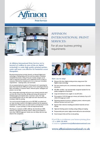 At Affinion International Print Services we’ve invested £2 million in state-of-the-art digital technology to make high quality printing quicker, easier and more cost-effective for businesses across Hampshire. Revolutionising business printing, dynamic on-demand digital print technology is making large print-runs and the problem of obsolete stockpiled documents a thing of the past. Instead, changes can be made to important documents such as application forms as often as necessary, followed by a bespoke print run to meet your immediate requirements – reducing waste, cost and hassle. At our purpose-built print centre in Portsmouth we’re operating the latest Océ ColorStream 3500 print system. From marketing brochures, flyers and leaflets to customer letters, welcome packs, catalogues and posters, we can help. Our cutting-edge technology will ensure your printed materials stand out from the crowd, from tear-off slips and money-off vouchers to individual pages personalised with a customer’s name. Our hightech finishing system will cut, fold, staple and insert documents into envelopes ready for posting. You can be assured of quality since we’re ISO 9001 accredited and our team has been trained to the highest standards by the equipment manufacturers. What’s more, our print centre is overseen by an on-site technician – so your printing is in safe and experienced hands. Working at a resolution of 600 x 600 dpi, the ColorStream 3500 achieves crisp details and vibrant colours, while at print speeds of more than 1,000 A4 pages per minute, you can always stay one step ahead of the competition.