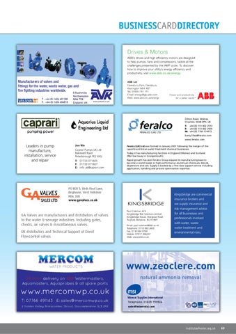 BUSINESSCARDDIRECTORY Drives & Motors ABB’s drives and high efficiency motors are designed to help pumps, fans and compressors, tackle all the challenges presented by the AMP cycle. To discover how to improve your utility’s energy efficiency and productivity, visit www.abb.co.uk/energy