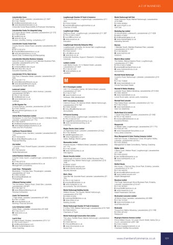 Leicestershire County Cricket Club County Ground, Grace Road, Leicester, Leicestershire LE2 8AD T: 08712 821879 E: enquiries@leicestershireccc.co.uk W: www.leicestershireccc.co.uk Sports Club, Conferencing and Banqueting Leicestershire Education Business Company Ashcroft House, Ervington Court, Meridian Business Park, Leicester, Leicestershire LE19 1WL T: 01162 407000 E: contactus@leics-ebc.org.uk W: www.leics-ebc.org.uk Education Business Links Leicestershire Fit For Work Service 2nd Floor, 9 Newarke Street, Leicester, Leicestershire LE1 5SN T: 01162 851710 E: admin@leicesterfit4work.org.uk W: www.leicesterfit4work.org.uk Occupational Health Services Lestercast Limited Investment Casting Centre, Ireton Avenue, Leicester, Leicestershire LE4 9EU T: TPS 01162 767284 E: info@lestercast.co.uk W: www.lestercast.co.uk Castings Let Me Organise You 9 Home Avenue, Leicester, Leicestershire LE3 3UR T: 07526 764603 W: www.letmeorganiseyou.co.uk Virtual PA Liberty Media Productions Limited Workspace 13, 2nd Floor Phoenix Square, 4 Midland Street, Leicester, Leicestershire LE1 1TG T: 01162 422875 E: info@libertymediaproductions.co.uk W: www.libertymediaproductions.co.uk Video and Film Production Lighthouse Financial Advice 15 Edgefield Close, Hamilton, Leicester, Leicestershire LE5 1UD T: 07748 644675 E: jas.dhillon@lighthousefa.co.uk Financial Planning Lily Limited 1 Junction Road, Russell Square, Leicester, Leicestershire LE1 2HS T: 01162 624233 Textile Manufacturer Linked Business Solutions Limited 5 Turner Close, Quorn, Loughborough, Leicestershire LE12 8DQ T: 07789 227216 W: www.linked-business-solutions-ltd.co.uk Management Consultancy Lionel Heap - Photographer Bramdene, 7 Ferneley Rise, Thrussington, Leicester, Leicestershire LE7 4UA T: 01664 424929 E: lionelheap@talktalk.net Photographer Littlewood Fencing Limited The Old Station, Station Road, Great Glen, Leicester, Leicestershire LE8 9FP T: 01162 592112 W: www.littlewoodfencing.co.uk Fencing Contractors Lloyds Tsb Commercial 7 High Street, Leicester, Leicestershire LE1 9FS T: 07801 472861 W: www.lloydstsb.co.uk Banking/ Financial Services Loros Enterprises Limited Groby Road , Leicester, Leicestershire LE3 9QE T: 01162 313771 W: www.loros.co.uk Charity Loud & Clear 6 Trafford Road, Hinckley, Leicestershire LE10 1LY T: TPS 01455 230317 E: info@loudandclearuk.com W: www.loudandclearuk.com Voice Coaching