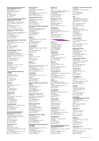 National Research Development Institute for Electrical Engineering (ICPE – CA) Wilhelm Kappel Splaiul Unirii Nr. 313, Sector 3, Bucharest RO-030138 Romania E: kappel@icpe-ca.ro T: +40 21 346 7231 W: www.icpe.ro National Science and Technology Program for Nanoscience and Nanotechnology Tsing-Tang Song Institute of Physics, 128 Academia Road, Section 2, Nangkang, Taipei RC-115 Taiwan E: ttsong@phys.sinica.edu,tw T: +886 3 582 0100 W: http://nano-taiwan.sinica.edu.tw National Starch and Chemical Company Richard Ellis Prestbury Court, Greencourts Business Park, 333 Styal Road, Manchester M22 5LW United Kingdom E: richard.ellis@nstarch.com T: +44 161 435 3200 W: www.nstarch.com National Technology Agency of Finland (Tekes) Markku Lamsa Kyllikinportti 2, Länsi-Pasila, PO Box 69, Helsinki FIN-00101 Finland E: markku.lamsa@tekes.fi T: +358 10 60 55793 W: www.tekes.fi Nationale Kontaktstelle Werkstoffe Show-Ling Lee-Muller Project Management Juelich, New Materials and Chemistry Division, Forschungszentrum Julich GmbH, Wilhelm-Johnen-Straße, Jülich D-52425 Germany E: s.l.lee-mueller@fz-juelich.de T: +49 2461 61 4471 W: www.nks-werkstoffe.de NEF & Co AG Louis Scharer Mövenstrasse 18, St Gallen CH-9015 Switzerland E: l.schaerer@nef-yarn.ch T: +41 712 284 730 W: www.nef-yarn.ch NelloCarrara Institute of Applied Physics (IFAC-CNR) Fulvio Ratto Via Madonna del Piano 10, Sesto Fiorentino I-50019 Italy E: f.ratto@ifac.cnr.it. T: +39 055 522 5307 W: www.ifac.cnr.it Nesli Co Ltd Unal Kazak Çam Koru Sitesi No: 2, Kuyuluk, Mezitli, Mersin Turkey E: ukazak@nesli.com.tr T: +90 324 359 0970 W: www.nesli.com.tr NetDyalog Limited Mr Jezz Leckenby Director 39 de Bohun Court, Saffron Walden, Essex CB10 2BA United Kingdom E: jezz@netdyalog.com T: +44 1799 521 881 W: www.netdyalog.com Netstal-Maschinen AG Thomas Aschenbrenner, Näfels CH-8752 Switzerland E: marketing@netstal.com T: +41 55 618 6111 W: www.netstal.com New Energy and Industrial Technology Development Organisation (NEDO) Akihiko Nishiki 19F MUZA Kawasaki Central Tower, 1310 Omiya-cho, Saiwai-ku, Kawasaki, Kanagawa J-212-8554 Japan E: nishikiakh@nedo.go.jp T: +81 44 520 5220 W: www.nedo.go.jp Newcastle Science City Peter Arnold Chief Executive Time Central, 32 Gallowgate, Newcastle-upon-Tyne, Tyne & Wear NE1 4SN United Kingdom E: peter.arnold@newcastlesciencecity.com T: +44 191 231 2200 W: www.newcastlesciencecity.com