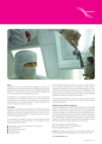 Scope AssuredNano® is the nanomaterials SHE accreditation scheme for all organisations producing nanomaterials, nano-enabled products, plus users of nanotechnology in general. It promotes the responsible and proactive application of nanomaterial SHE good current practice throughout the entire nanomaterials and nanotechnology community. AssuredNano® is an accreditation scheme which is both comprehensive in its scope, but also in application. It has just as much relevance to the research group in a corporate or university laboratory as to a manufacturer of nanomaterials or nano-enabled products. It is equally applicable to the SME as to the global multinational company. The benefits Accreditation to AssuredNano® demonstrates to all stakeholders that your organisation takes nanomaterial SHE seriously and is committed to the adoption and maintenance of good current practice. The fact that it is designed by industrially experienced SHE experts means that it promotes a commonsense approach to SHE. The AssuredNano® Accreditation Scheme is the only accreditation scheme which is all-embracing, covering all facets of a nanomaterial or nanoenabled product’s life including: n n n n n