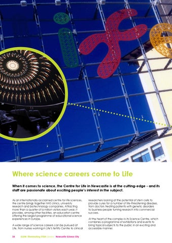 Where science careers come to Life When it comes to science, the Centre for Life in Newcastle is at the cutting-edge - and its staff are passionate about exciting people’s interest in the subject. As an internationally-acclaimed centre for life sciences, the centre brings together NHS clinics, university research and biotechnology companies. Attracting more than a quarter of a million visitors each year, it provides, among other facilities, an education centre offering the largest programme of educational science experiences in Europe. A wide range of science careers can be pursued at Life, from nurses working in Life’s fertilty Centre to clinical 38