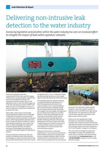 estimates. The robustness of data and the hardware mean that a greater number of pipelines can be retrofitted with high-quality leak detection. The approach has also been used for theft detection and location with great success in the oil sector. Systems are now operational in high consequence areas (HCAs), challenging climates such as deserts and arctic conditions. Leak detection projects including the use of the Atmos Eclipse solution have been delivered in the United Kingdom, Singapore and Belgium. This cross-over technology has significant advantages for rising main pipelines and trunk mains. To discover more about Atmos International visit www.atmosi.com or call + 44 161 445 8080 to speak to one of our leak detection experts.