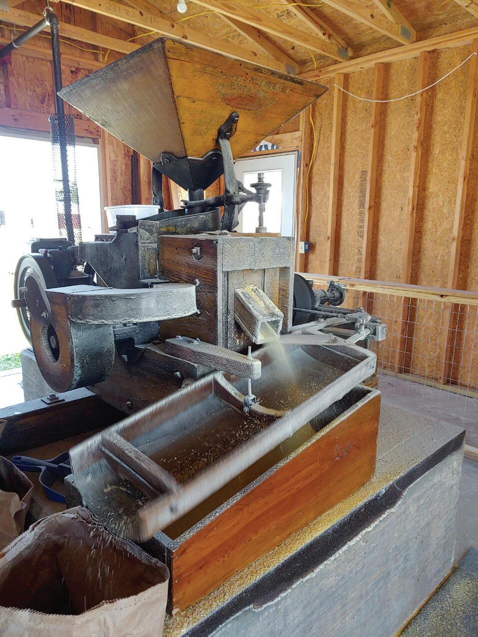 It is a 1912 Williams grain Mill powered by a 6 hp 1930’s Fairbanks-Morse gas engine. The granite stones are upright, with one stationary stone and one that rotates. The gap between the stones can be changed to allow for a fine or coarse flour to be made. We grind yellow corn for sale, and have ground blue corn for the Pawnee Nation.