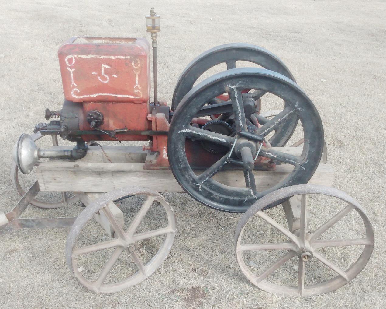 This is a hit and miss style engine., equipped with a WICO EK magneto, used to power feed grinders, well pumps, augers and almost anything that required a small engine to run. This story tells of the fun and comradery the hobby brings to those involved. We purchased this engine from an auction in Reeder North Dakota, at the time we did not have any way to haul it, we were on the way back from California in our car. We called my brother-in-law Chuck in Minneapolis and asked him if we purchased stuff from the auction could he bring a trailer to pick the stuff up, he agreed. The auction started and we made our first purchase and called Chuck. The temp was in the 90’s that Saturday. Chuck drove through the night, by Sunday morning there was snow flurries and it had dropped below 32 degrees as we loaded up the engines on the back of his truck and our car on the trailer. I started driving at some point we hit construction and we needed to make a lane change, suddenly it felt as if we had a flat tire on the rear of the truck. We pulled over into the ditch, jumped out and to our amazement all tires looked great. We pulled off the hub cap of the tire we thought was making the noise and was shocked to see all but one of the lug nuts broken off and the lug nut holes destroyed. Luckily, we had a spare car along to drive into town, what could possibly go wrong? did I mention Sunday in North Dakota they have what is called “Blue Law” meaning Businesses are not open, however our luck had not run out. We noticed someone working on their personal vehicle at a service station, we discussed our dilemma with him, he grabbed a coffee can off the shelf full of lug studs of various styles, rummaged through and thought he could make them work! He grabbed his tow truck, drove to pick up Chucks truck, fixed the lug studs and off we went. What a great trip we will never forget.