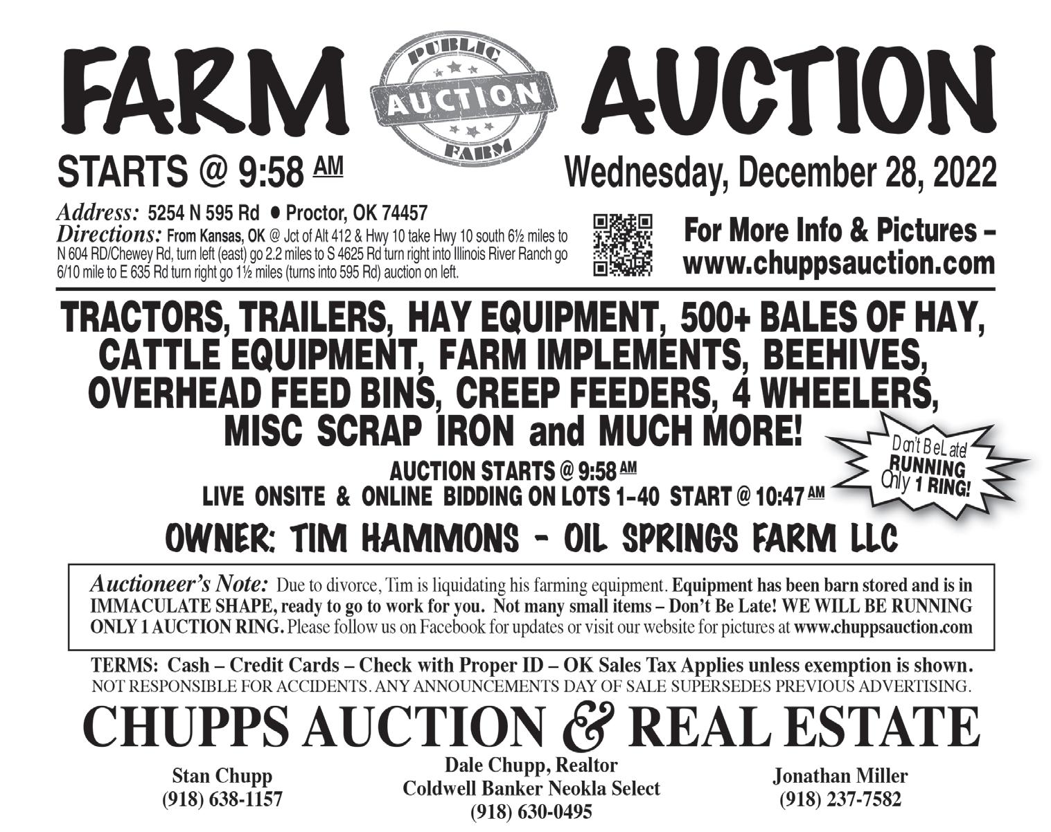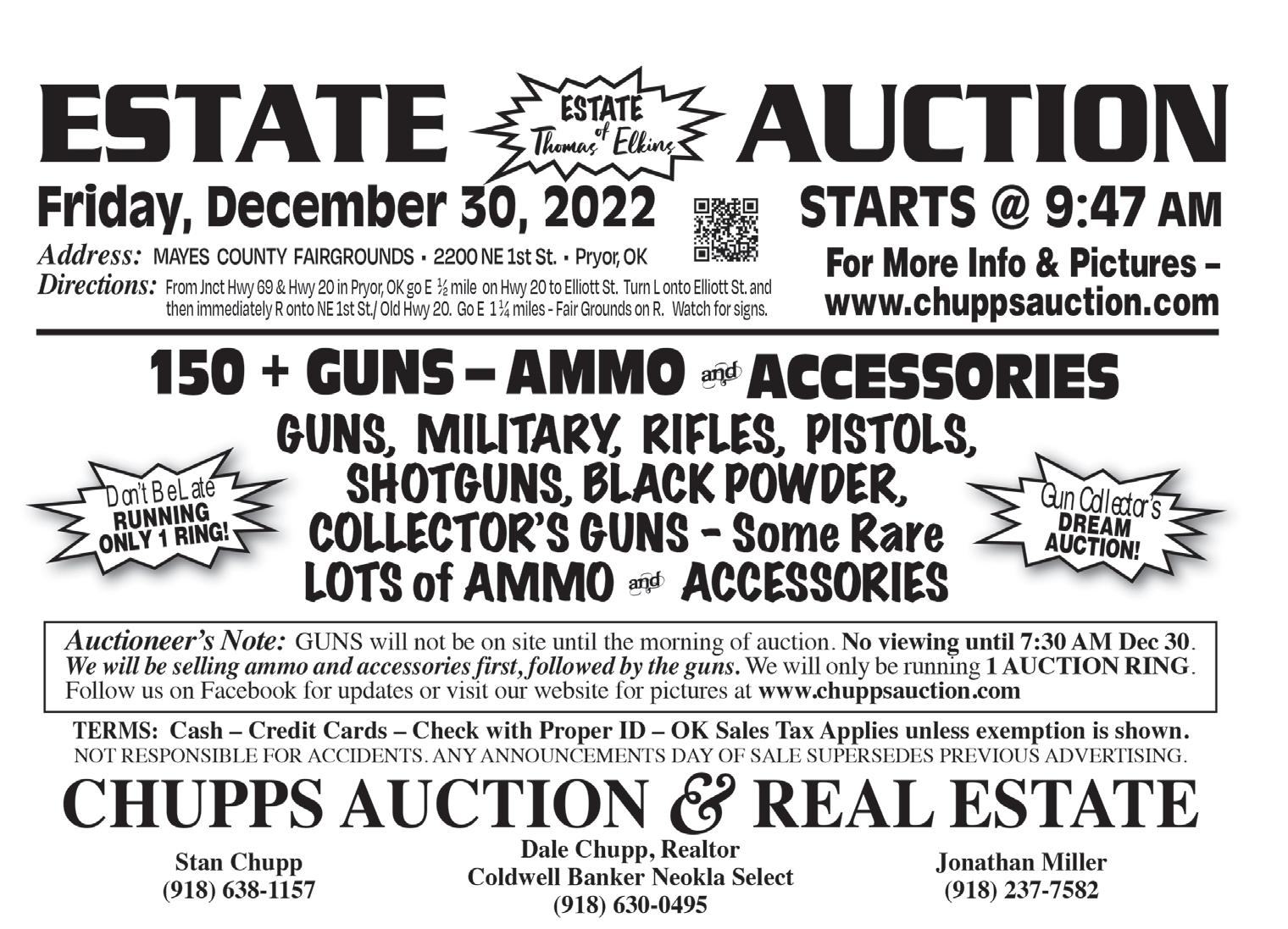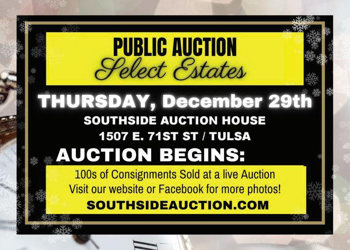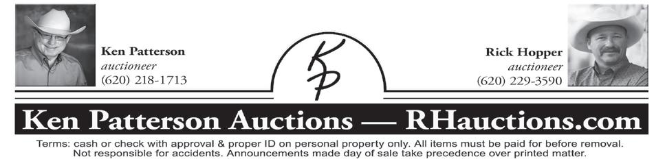 Antiques & Collectibles, Auctions, Flea Markets, Garage & Yard Sales, Mobile Homes, Real Estate, Rentals, Much More! OKLAHOMA’S Choice WEEKLY AUCTION & REAL ESTATE Oklahoma's Choice Weekly From switching o nerve-induced back pain like a light to spinal fusion and artificial disc replacement, our comprehensive approach to treating pain includes the expertise of both orthopedic spine surgeons and pain management specialists who are skilled in the latest treatments. The future of back pain treatment is here at Stillwater Medical. 405.707.0900 • ORTHOOK.COM We’ve got your back. DOWN THE RABBIT HOLE AT GREENS CORNER 723 E. Main St. Shawnee, OK 405-388-5778 Wednesday-Saturday 10am-5pm Collectibles, Cast Iron, Furniture and More!! Calling all Buyers, sellers and traders! Oklahoma's Choice Weekly is the new shopper in town, and we are on a mission: Connect Oklahoma buyers and sellers! It's that easy! 918-528-7689 Our 62nd Year in Business DIBBLE RETIREMENT AUCTION gy TION all sell! OKLAHOMA’S AUC TIONEER 619 S. Lewis • Stillwater, OK 74074 405-533-2600 pickensauctions.com AUCTION CALENDAR For Details & Pics, Go to: www.Theurer.net or www.Theurer.hibid.com Apr 11 Apr 12 Apr 12 Apr 12 Apr 25 May 1 May 7 1101 East 16th Street • Wellington, KS 67152 • 620-326-7315 • Theurer.net For Details & Pics, Go To: www.Theurer.net 542 ACRES IN 3 TRACTS TILLABLE | NUSZ FARMS LLC Sumner Count y, KS 3 Tracts Located Near Argonia and Conway Springs Kansas ONLINE ONLY: Thursday, December 29, 2022 NOT RESPONSIBLE FOR ACCIDENTS. ANY ANNOUNCEMENTS DAY OF SALE SUPERSEDES PREVIOUS ADVERTISING. CHUPPS AUCTION & REAL ESTATE Stan Chupp Dale Chupp, Realtor Jonathan Miller (918) 638-1157 Coldwell Banker Neokla Select (918) 237-7582 (918) 630-0495 Huge Estate &Real Estate Auction Thursday, January 12, 2023 STARTS @ 9:13AM Address: 57540 S. 37020 Rd. • Terlton, OK 74081 Directions: From Jnct of Hwy 412/64-48 Take Cleveland Exit. Immediately take Hwy 48 S 3 mi to Rd 5750. Turn Right (W). Go 2/10 mi. Auction on Corner of 5750 Rd & 37020 Rd., OR From Mannford, OK, take Hwy 48 N approx. 6 mi to Rd 5750. Turn Left (W). Go 2/10 mi. Auction on Corner of 5750 Rd & 37020 Rd. Watch for Signs. DALE & MARIA CHUPP (918) 630 - 0495 Coldwell Banker Neokla Select CLOSE TO KEYSTONE LAKE! ONSITE and ONLINE BIDDING! REAL ESTATE WILL SELL @ 12:01 PM CUSTOM HOME with BEAUTIFUL VIEW! Private 2.5 acres with custom built 2 bedroom 2 bath home, 2 car garage and full walk out basement. Built in 1984, 3292 sq ft +/- with huge kitchen, master suite, formal dining room and spacious back porch with a beautiful view 30x40 shop with 12’ OHD. Close to Keystone Lake. u OPEN HOUSES t Monday, Dec. 26th & Jan. 2nd from 3 - 5 pm Terms: 10% down day of sale, non-refundable, close in 30 days, no buyer contingencies 10% Buyers Premium. Fo r Mo re In fo an d Pics : www.ch upps au ct io n. co m AUC TION CALENDAR kenpattersonauctions.com JP Weigand & Sons INC For Sale: 160 Acres in Kay Count y Northwest of Newkirk. Saturday, Januar y 21, 2023 • 10am Winfield Fairgrounds, Winfield, KS Collectible Signs, Anvils, Primitives, License Plates, Collectible Oil Cans PREVIEW: Friday, Januar y 20 from 1-6pm