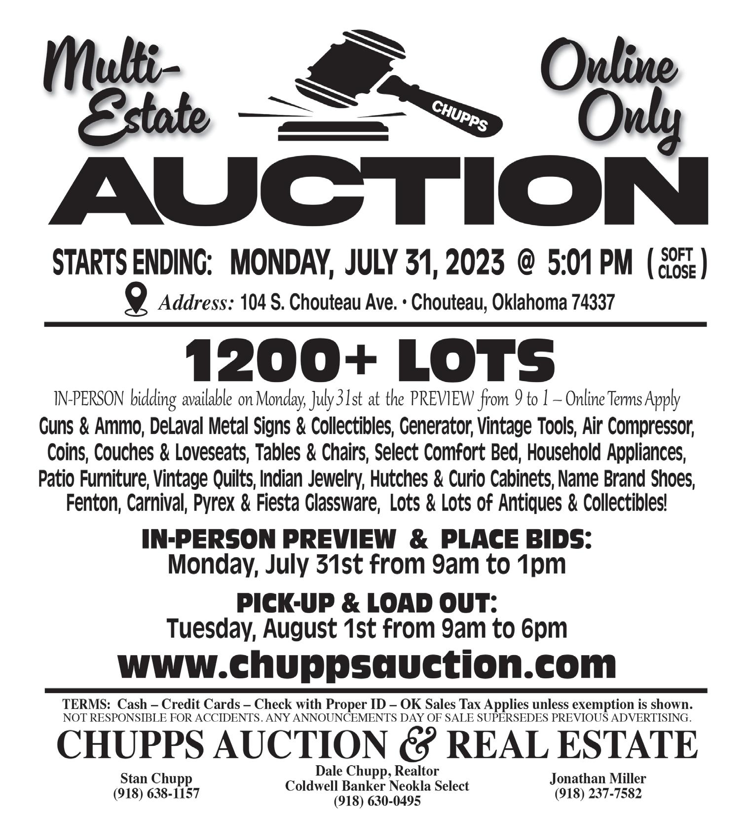 PAGE 10 - OKLAHOMA'S CHOICE WEEKLY THURSDAY, JULY 27, 2023 Subscribe For Your Oklahoma's Choice Weekly Digital Edition FREE at: www.oklahomas choice weekly.com Auction On Site Saturday, July 29 - 9:30 AM 709 South A Arkansas City KS Large Estate auction: Antiques, Collectibles, Furniture, Tools, and so much more! Hope to see you there! See list and photos at: Roth Auction Service LLC Facebook pag e Roth Auction Service LLC Web 620-262-7296 RothAuction@cox.net www.rothauction.us The Right Choice! Oklahoma's Choice Weekly! SPITLER & JOHNSON AUC TION & REALTY LIVE ON SITE AUC TIONS SATURDAY, July 29 @10 A.M. • Estate Auction, Prague OK. Real Estate: 22+ Acres in Prague with 2800 sq ft Custom Built Home, Large Shop Building, Pond. Very Nice Condition. Lots of opportunit y with this property. All selling contents. Name Brand Furniture, Antiques . Wat ch web site for mor e details. &SPITLER AUCTION REALTY JOHNSON 1-405-567-3523• PRAGUE, OK View More Information and Pictures on Website Plus Other Auction www.spitlerauction.com More Auctions Being Booked. The Right Choice! Oklahoma's Choice Weekly!