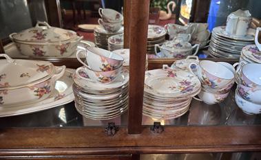 China Hutch, Glass Top Coffee Table, 2 Glass Top End Tables, 6 Drawer Dresser, Oval Table with 6 Chairs and 3 Leafs, Afghans, Quilts, Sewing Materials, Floor Lamps, Lots of Lamps, TV Armoire, 4 Drawer Filing Cabinet, Hall Tree w/ Mirror and Drawers, Stacked Bookcase, Assorted Neckties, Plant Stands, Many Dishes and Glasses.