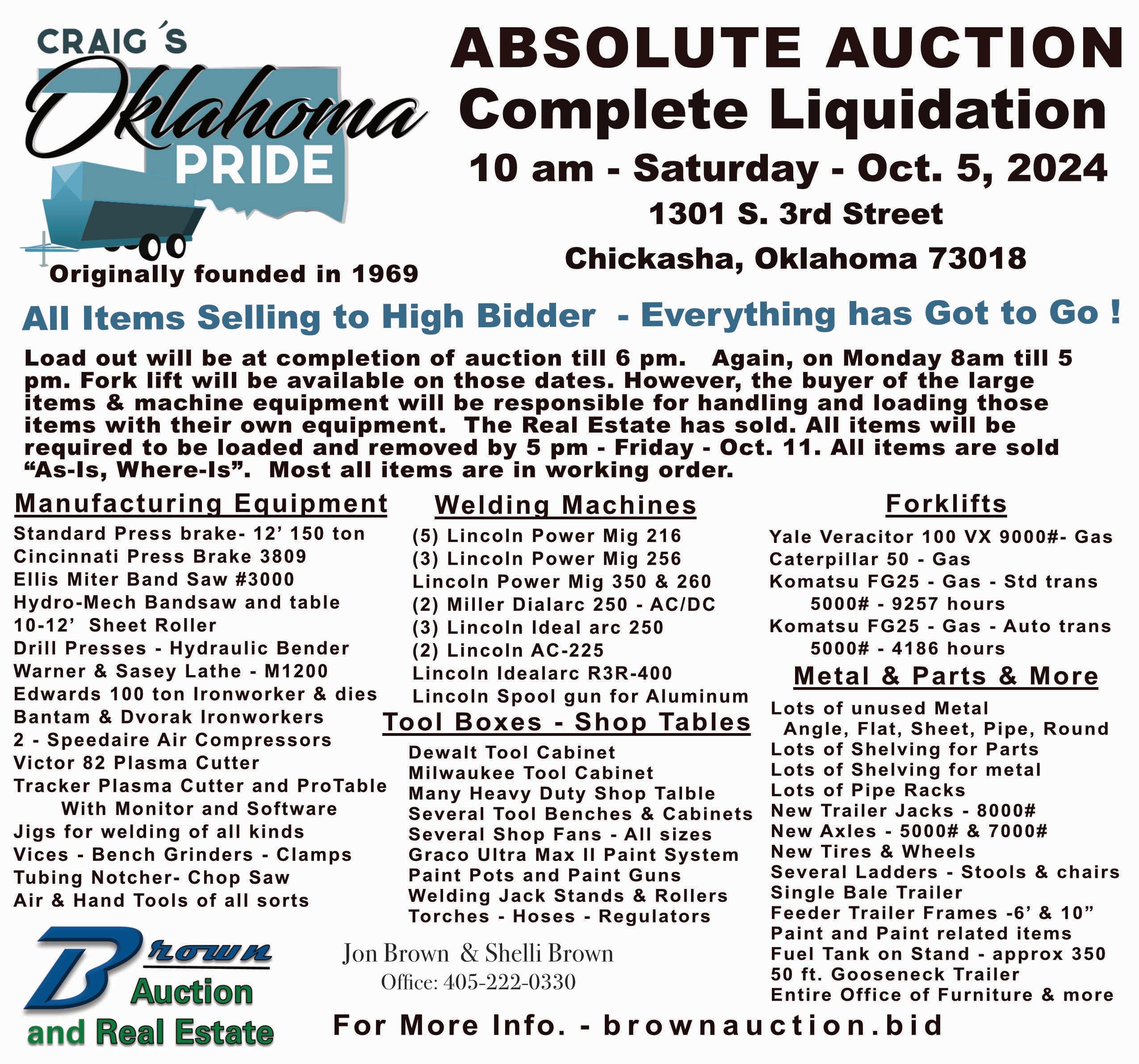 TERMS: Cash, check, VISA/MC/Discover/ on day of sale. There is a 3% convenience fee to use a credit/debit card. Driver’s license required to register Oklahoma Tax Comm. requires a copy of tax exempt certificate for exempt purchases. All items sell as is with no warranty. Descriptions are accurate to best of knowledge. Announcements made day of sale will supersede all other advertising. Seller or Auction Co. not responsible for accidents. Purchaser acknowledges that items purchased could be subject to United States laws and regulations, including those that relate to the export of items subject to export controls under the Export Administration Regulations, 15 CFR 730-774, and/or sanctions administered by the U.S. Department of Treasury’s Office of Foreign Asset Controls. Purchaser agrees that it is Purchasers responsibility to comply with any applicable laws or regulations regarding the export of the item(s).