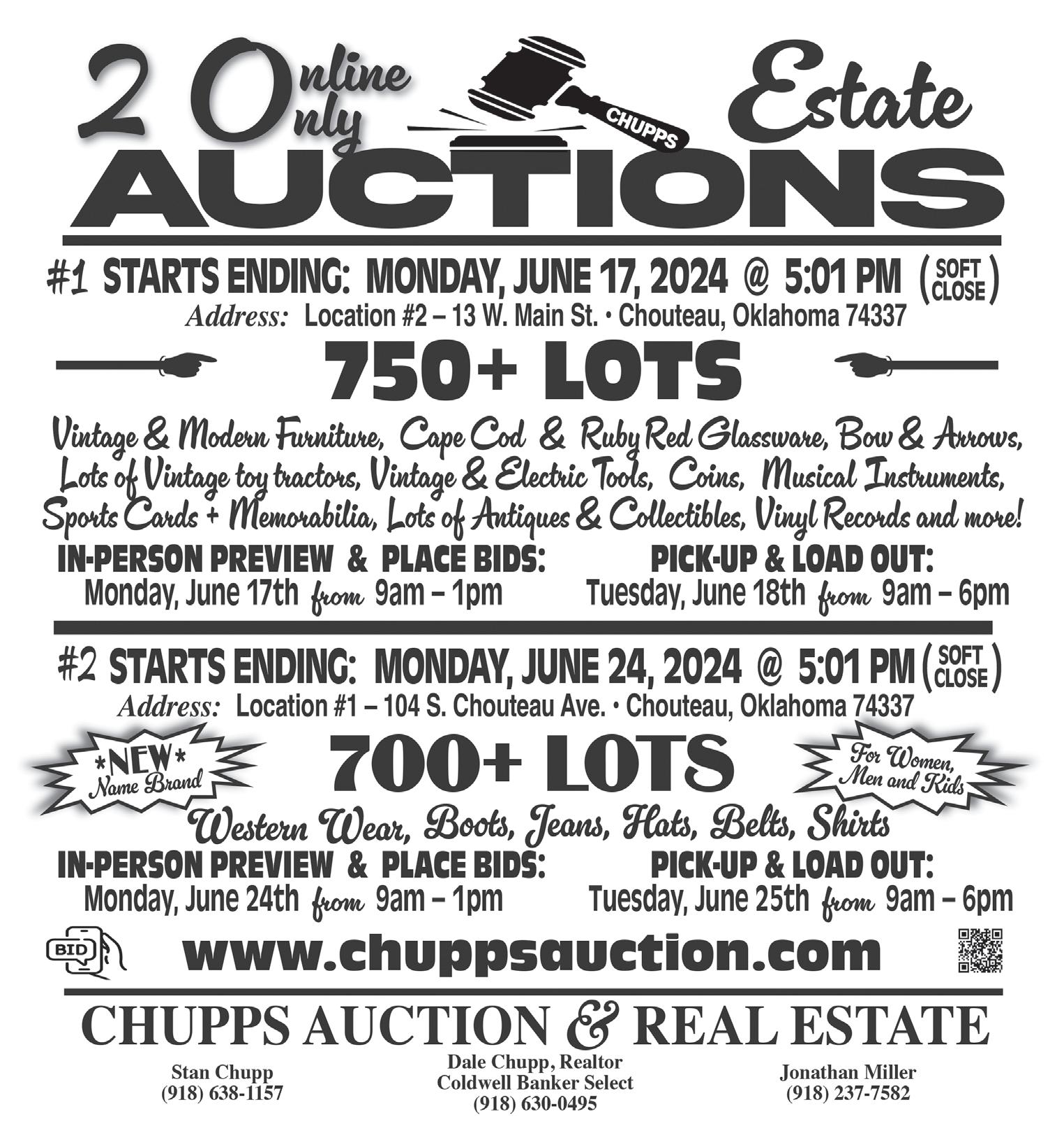 PAGE 6 - OKLAHOMA'S CHOICE WEEKLY THURSDAY, JUNE 13, 2024 BID NOW! purpl ewav e.com AU CT IO N GO VER NME NT EQUIPME NT TUESDAY, JUNE 25 325+ ITEMS SELL NO RESERVE! IN VE NT ORY INCLUD ES : skid stee rs pickup trucks wh eel loader bucket trucks SU Vs dump trucks , refuse truc k, ambulances , tracto rs fir e truc k, school bu ses, oil dist ributo r truc k, batw ing rotary mowe rs boat s, an d more All items are sold “AS IS .” 10% buyers premium applies. DP6429 ‘13 Fr eightliner M2 refuse truc k DP6427 Air Bur ner s Inc S22 0 FireBox refuse bur ner DP6431 ‘9 9 Fr eightliner FL80 bucket truc k EK8622 ‘0 9 John Deere 524K High Lift high lift EK8621 ‘2 1 Ford F150 XL SuperC ab pickup truck NG9802 ‘2 2 Kubota SV L9 72 trac ke d skid steer DQ2358 ‘2 2 Chev y Silver ado 2500HD Double Cab pickup EK4676 ‘2 0 Ford Ex plorer Police Interceptor SU V 2SELLING 2SELLING Real Estate & Reti rement Au ctio n Wednesday, June 19, 2024 STARTS @ 9:32 AM DIRECTIONS: From South Coffeyville, OK at the Jnct of Hwy 169 & Third Street (Welch State Bank) Turn E on Third Street. Go E ¼ mi to Etchen St. Turn Rt. Auction Site is first place on Left. Street Parking Available. Fo r mo re info rmatio n and pics: ww w. ch up ps au ct io n. co m DA LE & MARIA CH UP P Cold we ll Banker Se le ct (918) 630-0495 S. COF FEYV I LLE OP PORTUNIT Y! 313 Etchen Blvd. South Coffeyville, OK 74072 HHH OP EN HOUS ES HHH Monday, June 3rd & 10th from 4 – 6 pm (REAL ESTATE ONLY) REAL ESTATE WILL SELL @ 12:01 PM 125' x 140' Lot in South Coffeyville with 2 large shops and a 1976 mobile home used for storage. 30x60 Shop has 12' ceilings, 2 - 10x10 OHD, concrete floors, insulated, overhead heaters, A/C, all LED lights, single phase electric, ½ bathroom and is plumbed for air 30x50 Shop has 12' ceilings, 2 - 10x10 OHD, concrete floors, insulated, heater A/C, all LED lights, single phase electric and is plumbed for air Great Opportunity for 2 really nice shops! Absolute Auction, NO Reserve! TERMS: 10% down day of sale, non refundable, no buyer contingencies, close in 30 days. 10% Buyers Premium (Real Estate only). No Reserve. See www.chuppsauction.com for complete terms. 1966 RACE CAR / PROSTREET CORVETTE, CAR LI FT, PORTABLE BUILDI NGS, HIGH CUBE STORAGE CONTAI NER, AUTOMOTI VE LATHE, MI LL, WORKBENCHES, PARTS BI NS, HOIST, SAWS, VISES, PRESSES, AI R COMPRESSORS, AUTO PAI NT SHAKER, PAI NT SPRAYERS, PAI NT DRYER SYSTEM, AUTO SPECIALTY TOOLS, CHEVY RACI NG CAR PARTS, PAINT, SOME HOUSEHOLD FURNITURE, RADIO CONTROLLED AIRPLANES and HELICOPTERS & MORE! AUCTION STARTS @ 9:32AM — REAL ESTATE @ 12:01PM — ONSITE & ONLINE BIDDING ON LOTS 2– 55 START @ 12:22PM We W ill Be RUNNING 2 RINGS ALL DAY! OWNER: YOGI SNYDER — SOUTHTOWN STREET RODS NOT RESPONSIBLE FOR ACCIDENTS. ANY ANNOUNCEMENTS DAY OF SALE SUPERSEDES PREVIOUS ADVERTISING. CHUPPS AUCTION & REAL ESTATE Stan Chupp Dale Chupp, Realtor Jonathan Miller (918) 638-1157 Coldwell Banker Select (918) 237-7582 (918) 630-0495 Yogi Snider has won thousands of awards for his artistry and talent as an auto body Build & Paint Specialist. Southtown Street Rods has been his home, and now he’s retiring and moving on to new adventures. This sale is a rare opportunity to bid on some of his 50+ YEAR Accumulation. See What We Uncover! Lots of Specialty Paint Tools Not Listed. Follow us on Facebook for updates or visit our website for pictures at www.chuppsauction.com Auctioneer’s N e: @ ee 9:32 9: et. ONSITEandBIDDING!ONLINE AC TRAC TORS, LARGE QUANTIT Y TOOLS, 3P T EQUIPMENT, HUNTING DECOYS Online Only Date TBD East 80th Street South, Oxford, KS 67119