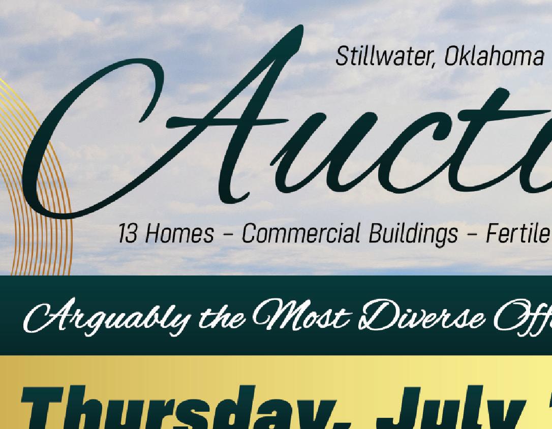 ES TION 53 , OK. l l l l l l l l l l l l l l l l l l l l l l l l l l Thursday, June 20, 2024 @ 5p.m. “Sharp” TERMS $10,000 Day of Auction. Balance upon Approval of Title, and Delivery of Deed. Possession upon Closing . Sur vey Furnished. Announcements made day of Auction supersede previous advertisements. SEE YOUR BANKER TODAY! Developers. Remodelers, Speculators, and Real Estate Investors, investigate this property Today! Located in the Central Part of the Prestigious STILLWATER GOLF AND COUNTRY CLUB. Walking distance to the #1 Tee on the Famous 18 Hole Golf Course Put ting Green, and Club House ® 405-372-2466 TOM D. BERRY, AUCTIONEER & BROKERS VISIT www.berr yauction.com • FOR MORE PHOTOS AND INFORMATION SPECIAL NOTICE: Home Will Require EXTENSIVE RENOVATION, and Will be Auctioned WITH ALL FAULTS.” Star t Your DUE DILIGENCE TODAY! 1101 S. Main •Sapulpa, OK Auction the 1st and 3rd Sunday of Each Month, Star ting at 1:30. David: 918-771-1718 • Keith: 918-855-7556 No auction on Father's Day, June 16th Oklahoma's Choice Weekly pickensauctions.com AUCTION CALENDAR For more details call Gregg Pickens, Broker/Auctioneer 405-533-2600 or 405-747-9304 or visit 619 S Lewis Stillwater, OK 74074 Follow us on Facebook - FACEBOOK.COM/PICKENSAUCTIONS COMMERCIAL REAL ESTATE AUCTION Offered in 2 Tracts or in Combination Friday, June 21 @ 10:00 am 34+/-acres 10317 W HWY 33, Coyle, OK. PLUS Commercial Grow and Retail Display Equipment. GENE L. RITTER ESTATE AUCTION Saturday, June 22 @ 10:00 am 6+/-acres & COUNTRY HOME PLUS PERSONAL PROPERTY 6605 N Brush Creek Road, Glencoe, OK Antiques - Furniture - Glassware - Household and MORE! 15,000 Square Foot Commercial Building and 34 Acres HWY 33 FrontagePerkins/Coyle OK Area. And watch for .... ONLINE ESTATE AUCTIONS Starting Soon! Go to pickensauctions.com to register and bid!