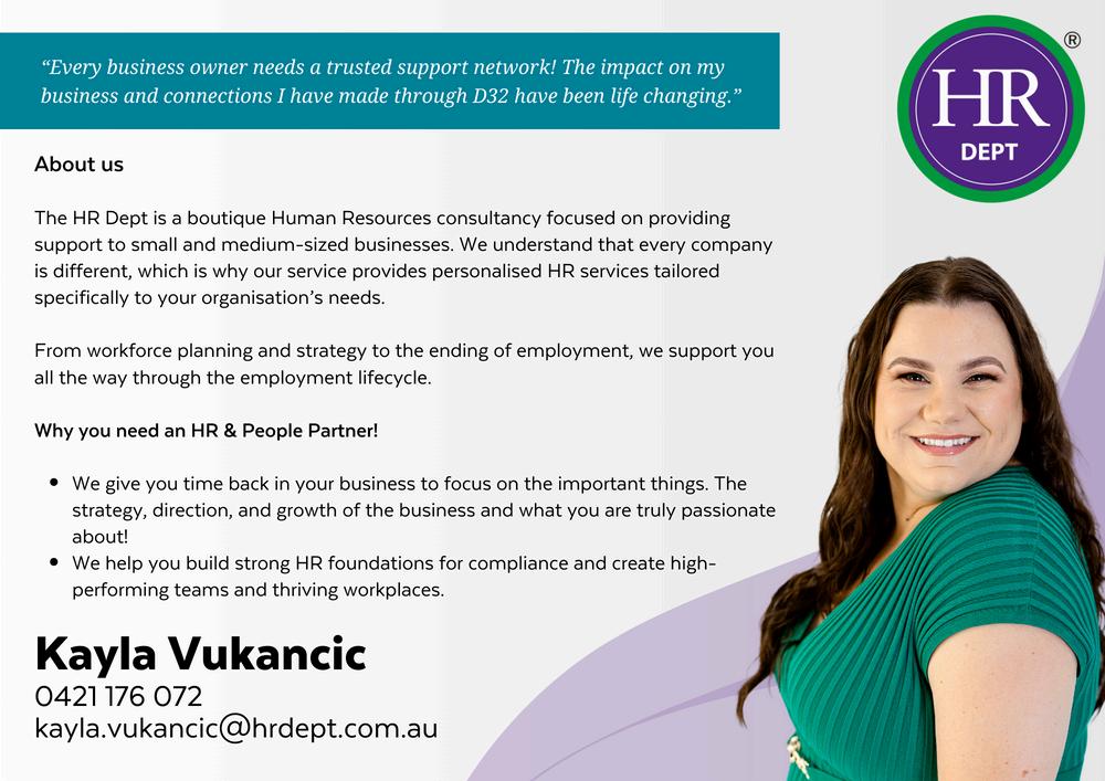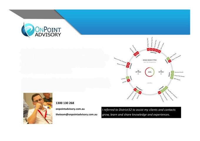 “I joined D32 about 6 months ago, and to be honest, I was a little sceptical about the value in joining How was it going to be different to other groups? My experience has been amazing, to say the least The model is good, encouraging strong and trusted relationships between the members rather than a grab for business, which I appreciate. But its the level of care and support provided by Dean and Lorraine that makes this organisation outstanding.”