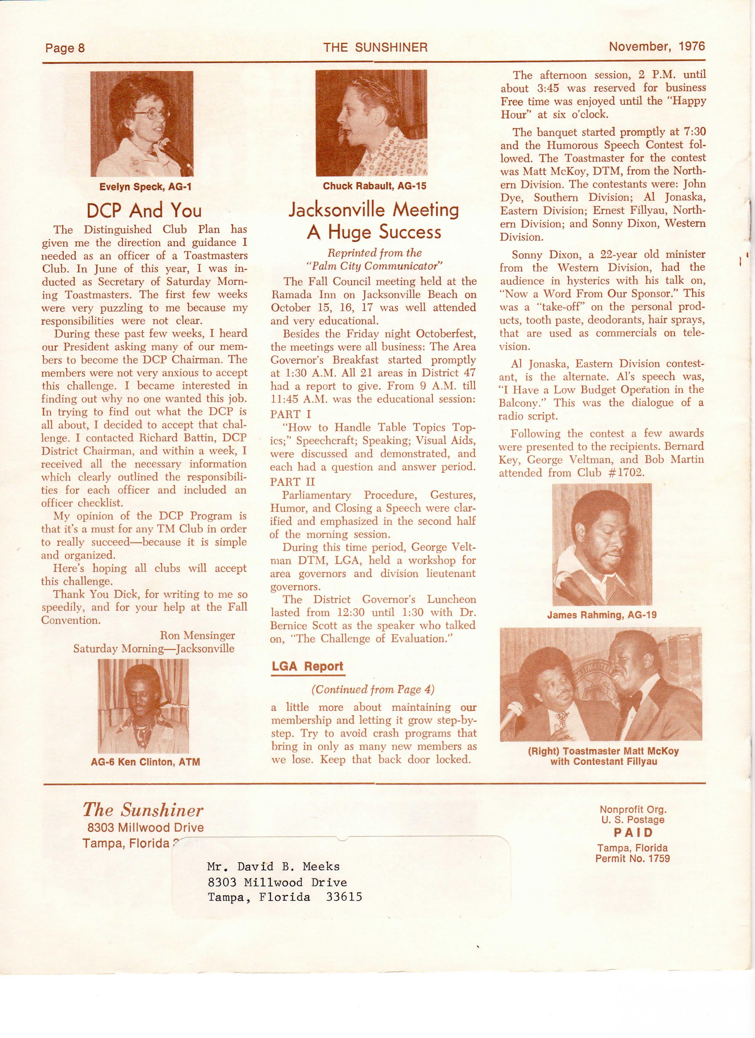Orlando Conquesors TM Club #1066 has been an active and outstanding example of a club for others to follow First, the SUNSHINER wants to publicly state that the subscrptions are now on their way Moreso, congratulations for conducting a YLP which saw a member, Pat Newcomb, go all the way to First Place in the NationalPublic Speaking Contest of the Jr Achievement organanization